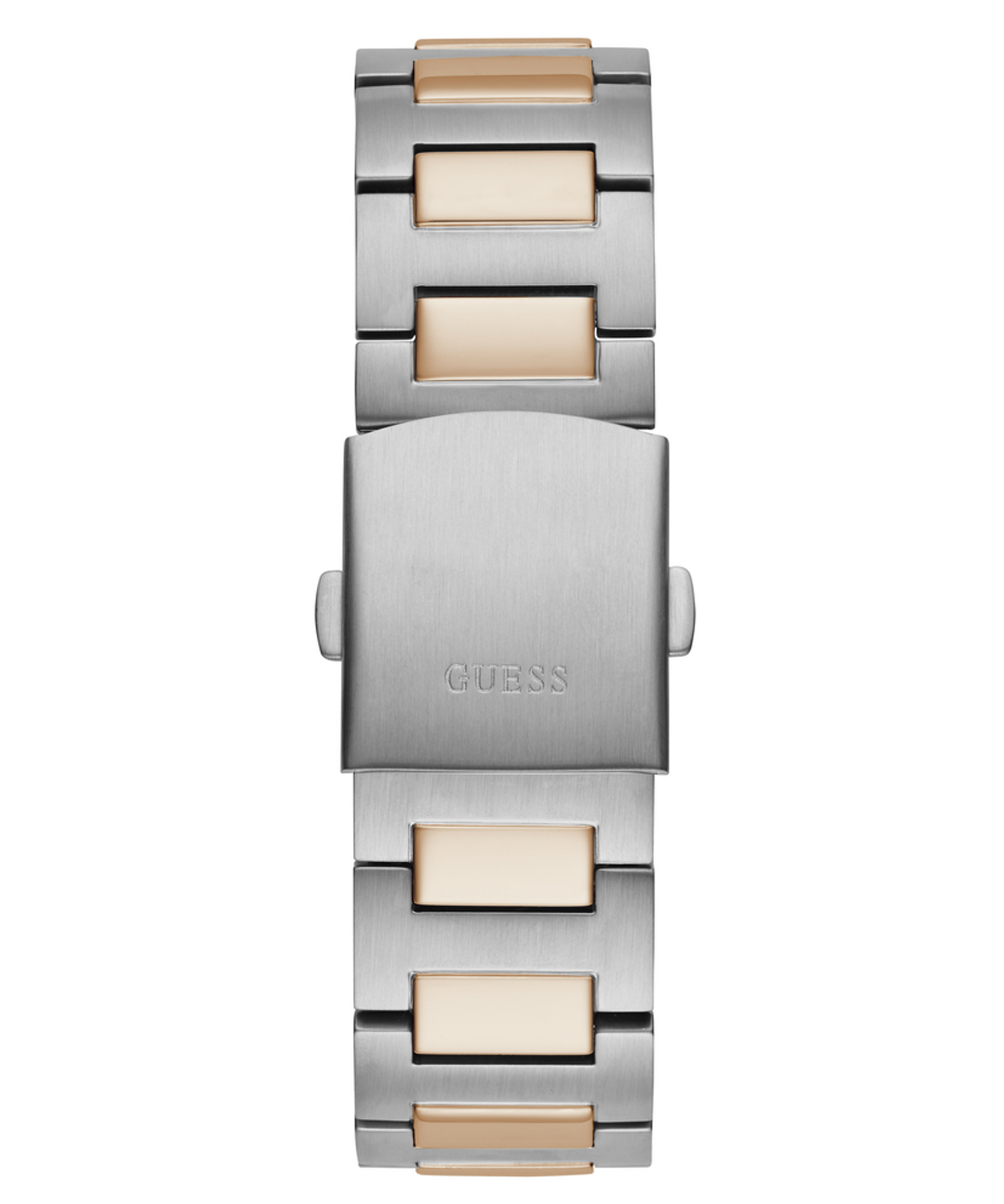 Оригінальний чоловічий наручний годинник GUESS. Колекція – GUESS DRESS. Годинник оснащений надійним кварцовим механізмом Miyota. Сталеві корпус та браслет з комбінованим покриттям Silver/Gold Tone. Діаметр корпусу – 42 мм, товщина – 10,1 мм. Безель оздоблений декоративними болтами. Аналоговий градієнт циферблат синього кольору. Стрілки та тимчасові мітки з люмінесцентним покриттям. Додатково – відображення дня тижня та дата. Водозахист 5 АТМ.