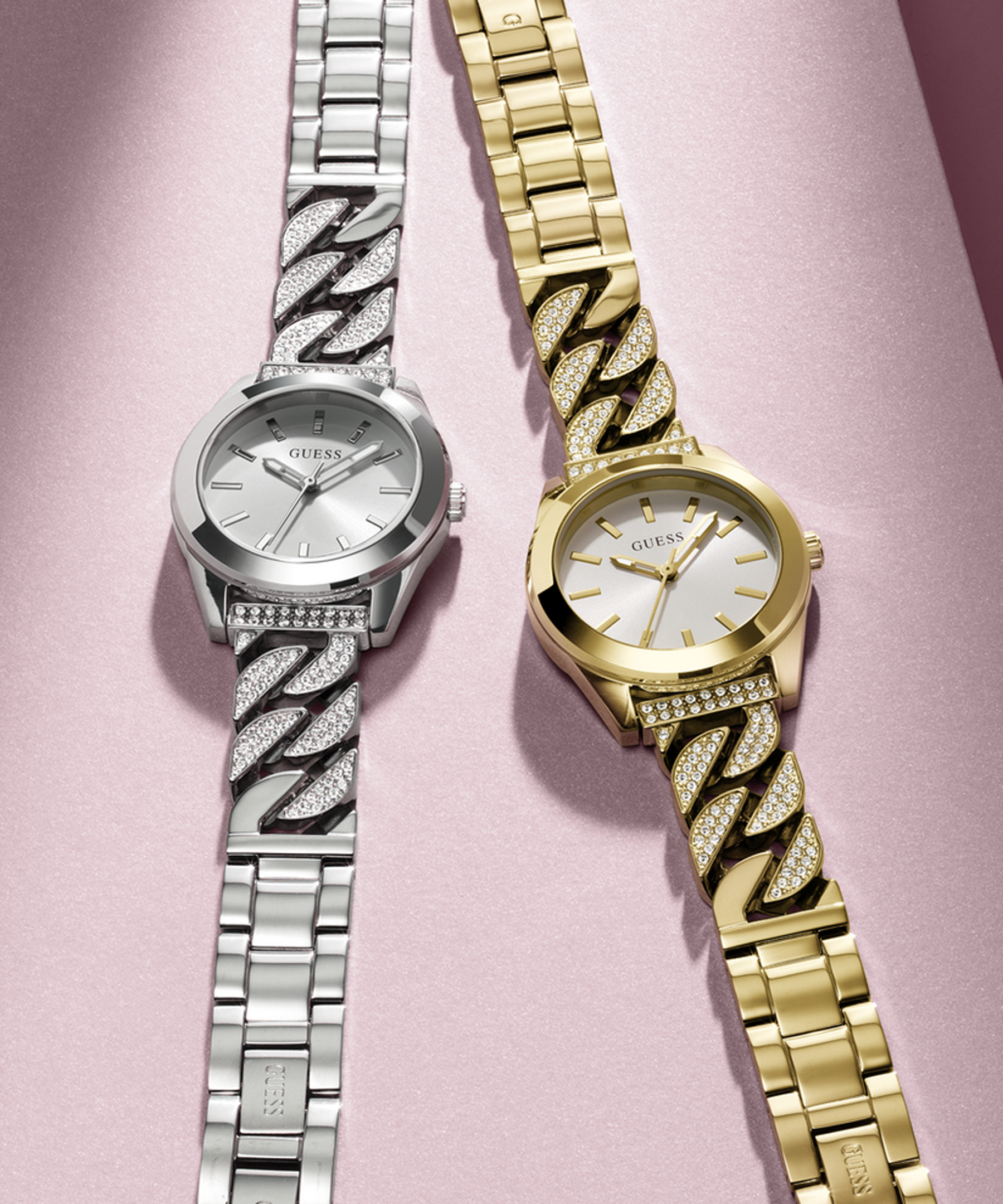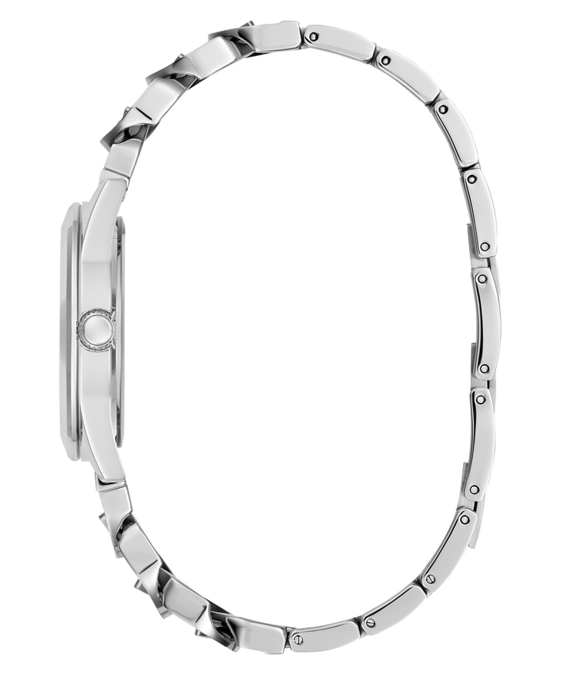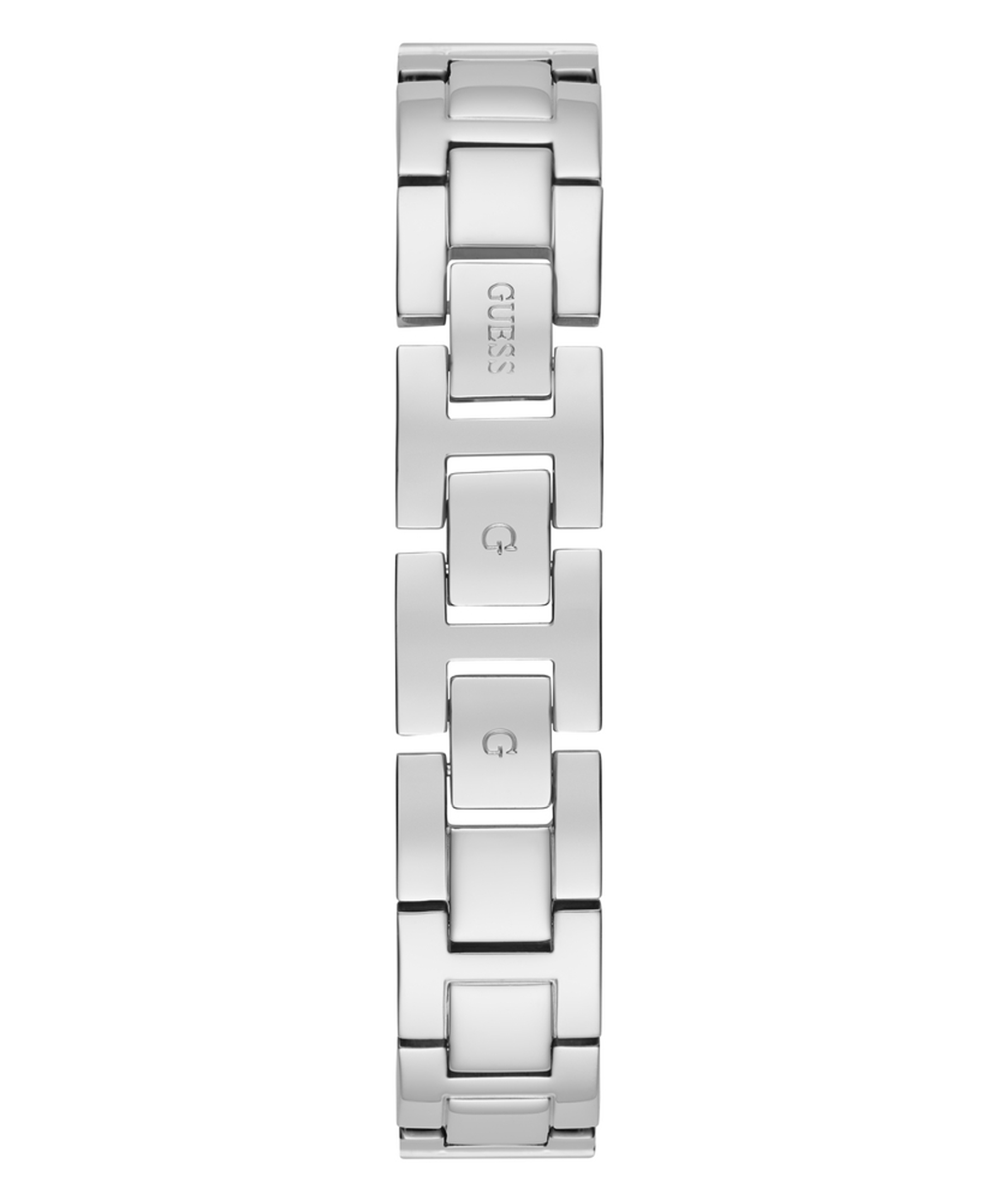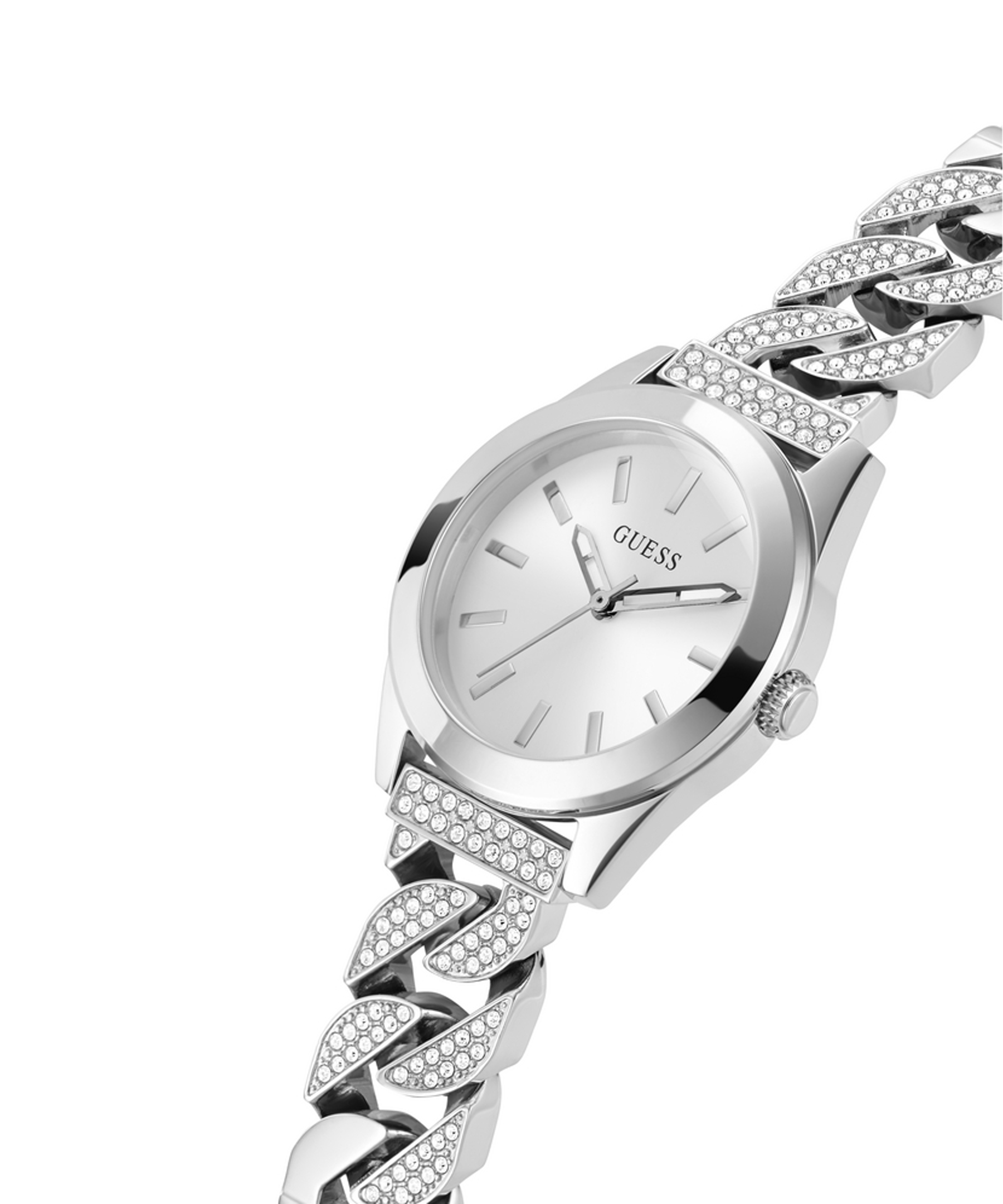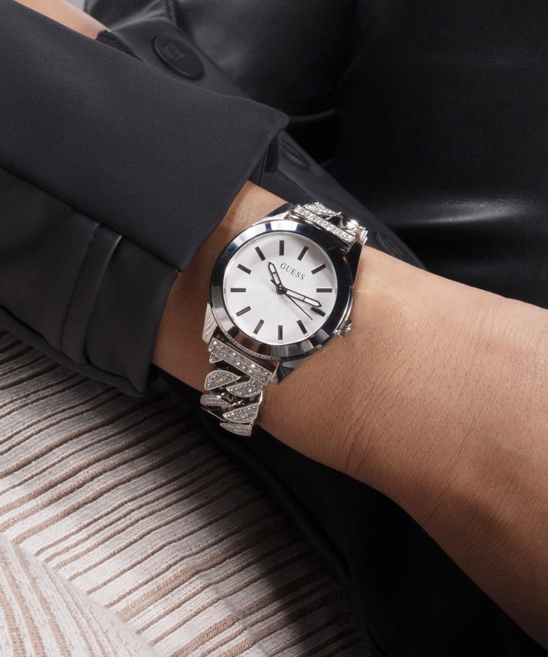 Оригінальний жіночий наручний годинник GUESS GW0546L1. Годинник із колекції LADIES TREND. Встановлено надійний кварцовий механізм Miyota. Сталеві корпус та браслет. Діаметр корпусу – 32 мм, товщина – 7,95 мм. Браслет декорований кристалами, що переливаються. Застібка – складана кліпса. На білому циферблаті – логотип бренду, тимчасові мітки та стрілки з люмінесцентним покриттям. Водозахист – 3 АТМ.