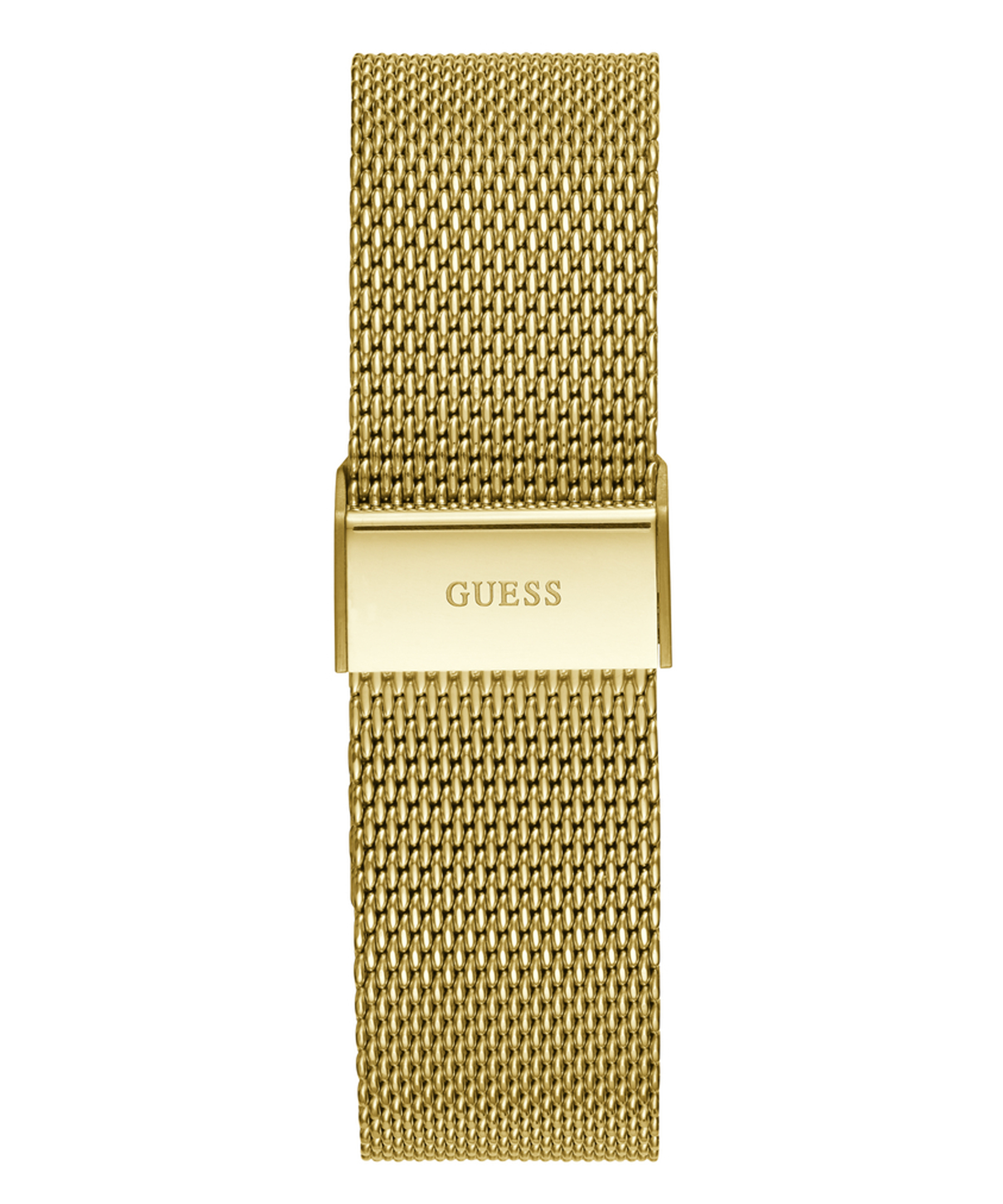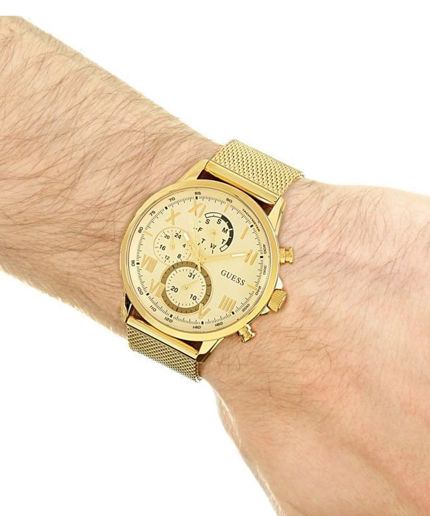 Чоловічий наручний годинник - хронограф популярного американського бренду GUESS у стилі MENS DRESS оснащений японським кварцовим механізмом Miyota. Корпус виготовлений зі сталі 316L з міцним PVD покриттям Gold. Поєднання багатофункціональності механізму та елегантності зовнішнього вигляду створили універсальний елітний аксесуар, який завжди підкреслюватиме Ваш вишуканий смак. Міцне мінеральне скло стійке до подряпин, має антивідблиску. Золотистий браслет у техніці міланського плетіння комфортно та надійно фіксує годинник на зап'ясті.