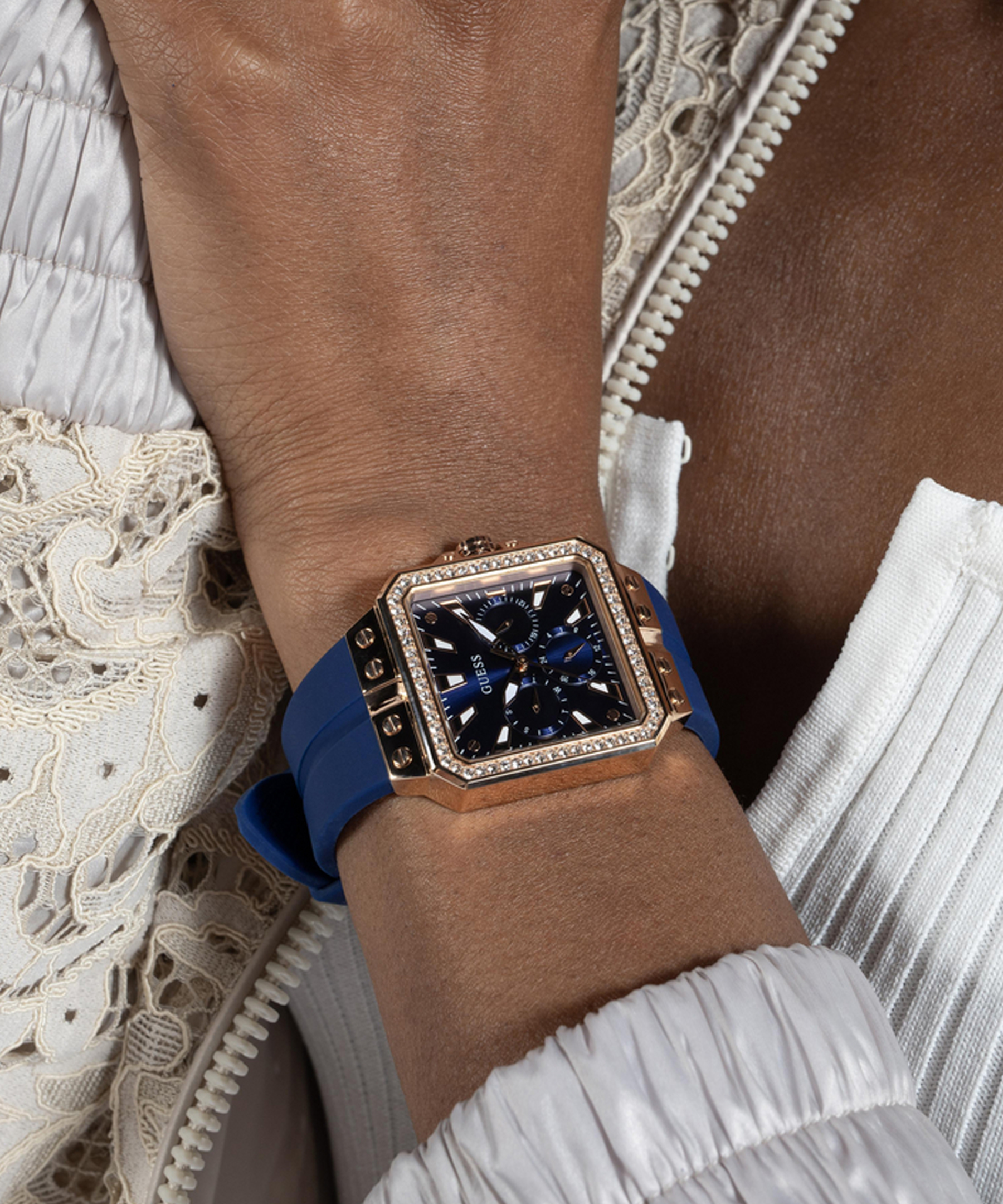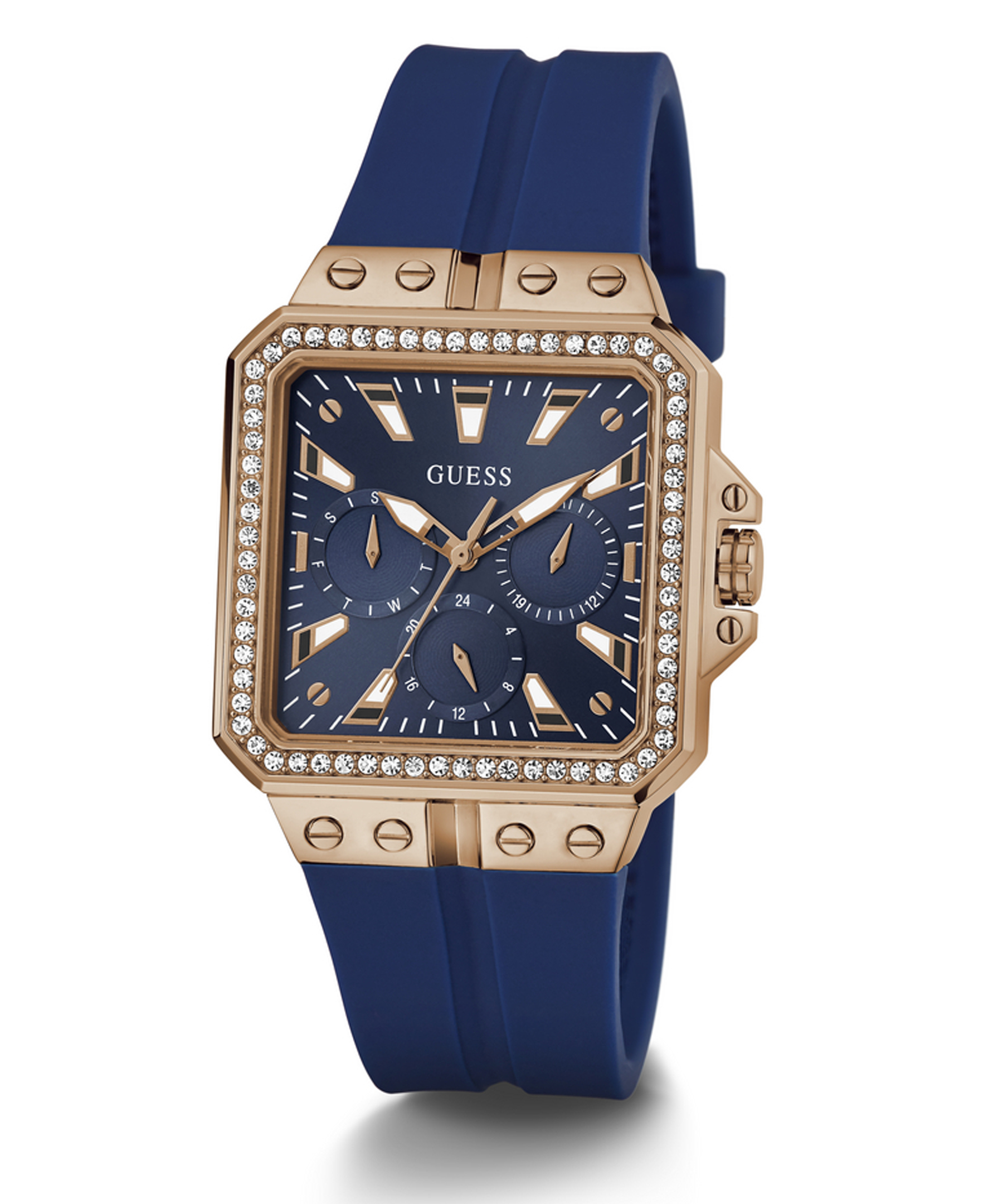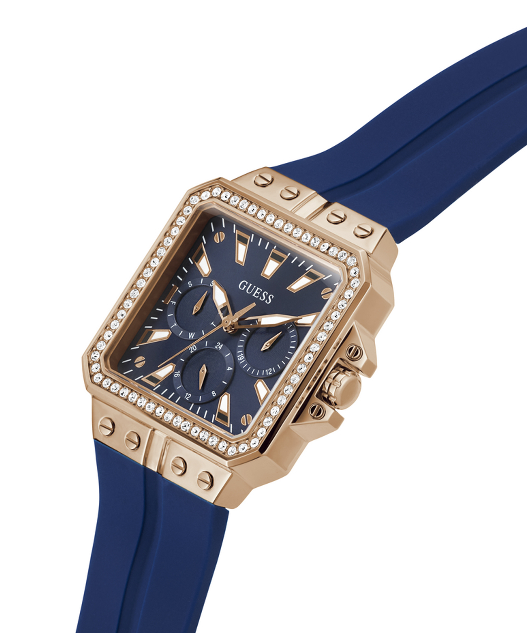 Оригінальний жіночий наручний годинник GW0618L2 легендарного американського бренду Guess. У годиннику встановлено надійний кварцовий механізм Miyota. Сталевий квадратний корпус із покриттям Gold Tone. Розмір корпусу – 34 х 34 мм, товщина – 9,1 мм. Безель декорований кристалами. Синій силіконовий ремінець із класичною застібкою - пряжкою. Ширина кріплення – 22,5 мм. Стрілки та тимчасові мітки з люмінесцентним покриттям. Додатково – відображення дня тижня та дата. Водозахист – 3 АТМ.
