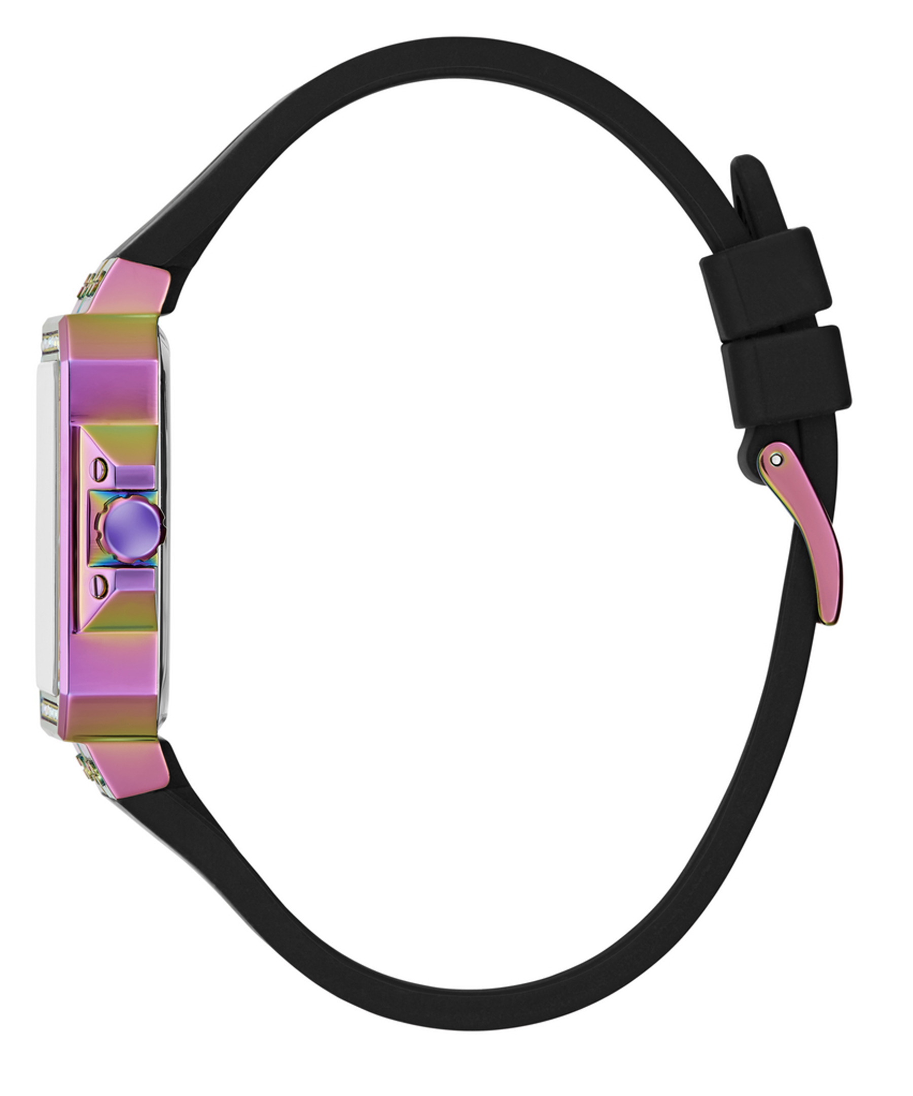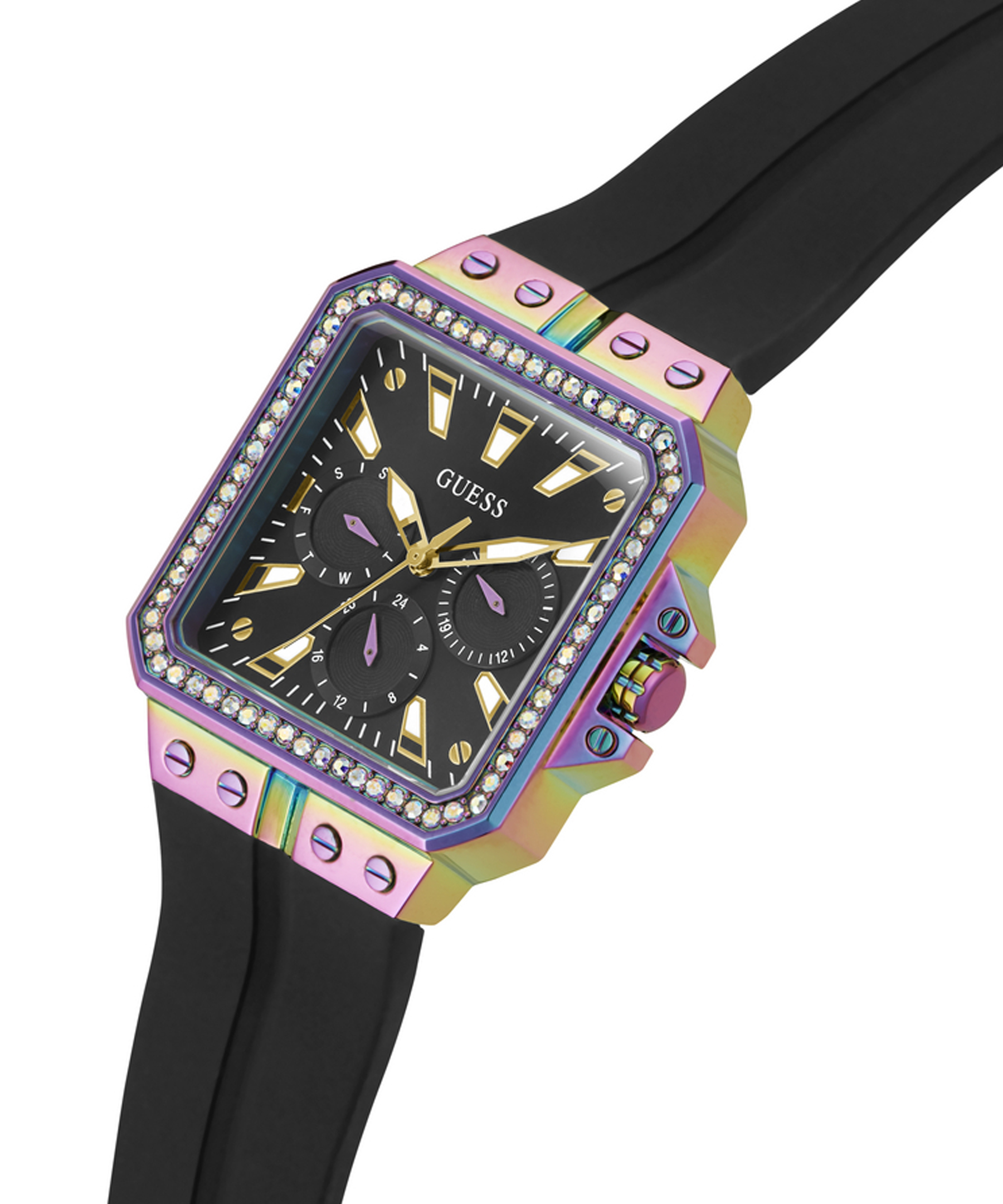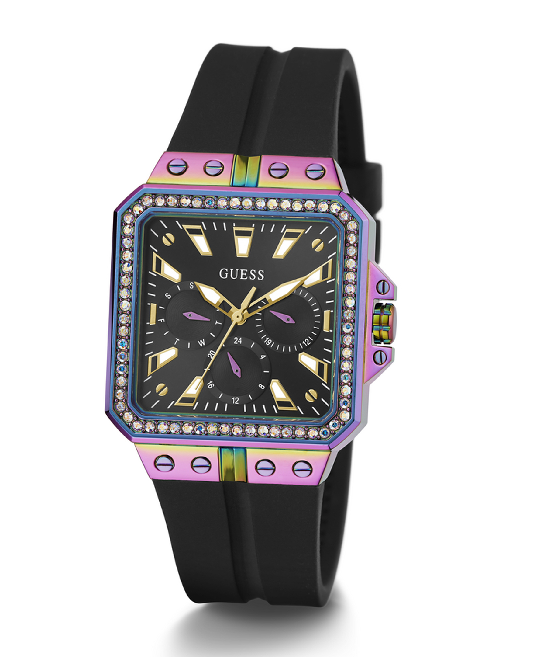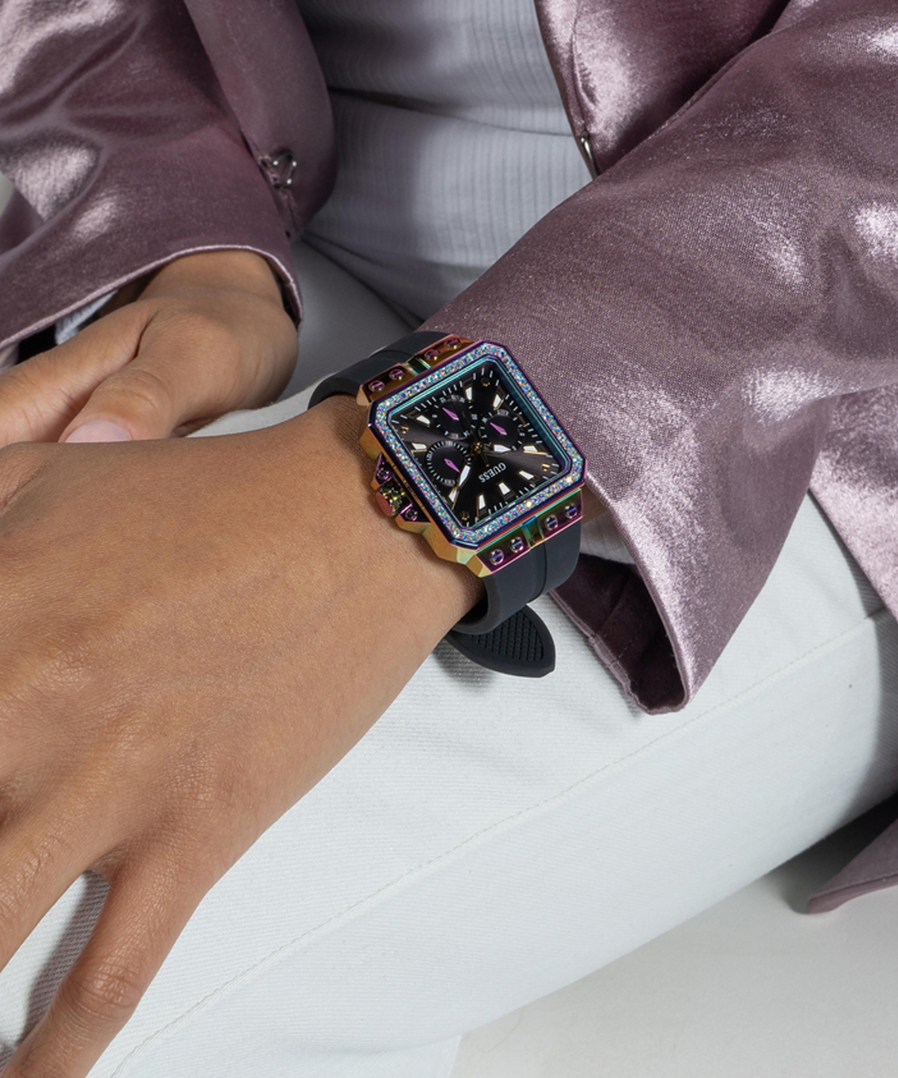 Оригінальний жіночий наручний годинник GW0618L3 легендарного американського бренду Guess. У годиннику встановлено надійний кварцовий механізм Miyota. Сталевий квадратний корпус з покриттям "хамелеон". Розмір корпусу – 34 х 34 мм, товщина – 9,1 мм. Безель декорований кристалами. Чорний силіконовий ремінець із класичною застібкою - пряжкою. Ширина кріплення – 22,5 мм. Стрілки та тимчасові мітки з люмінесцентним покриттям. Додатково – відображення дня тижня та дата. Водозахист – 3 АТМ.
