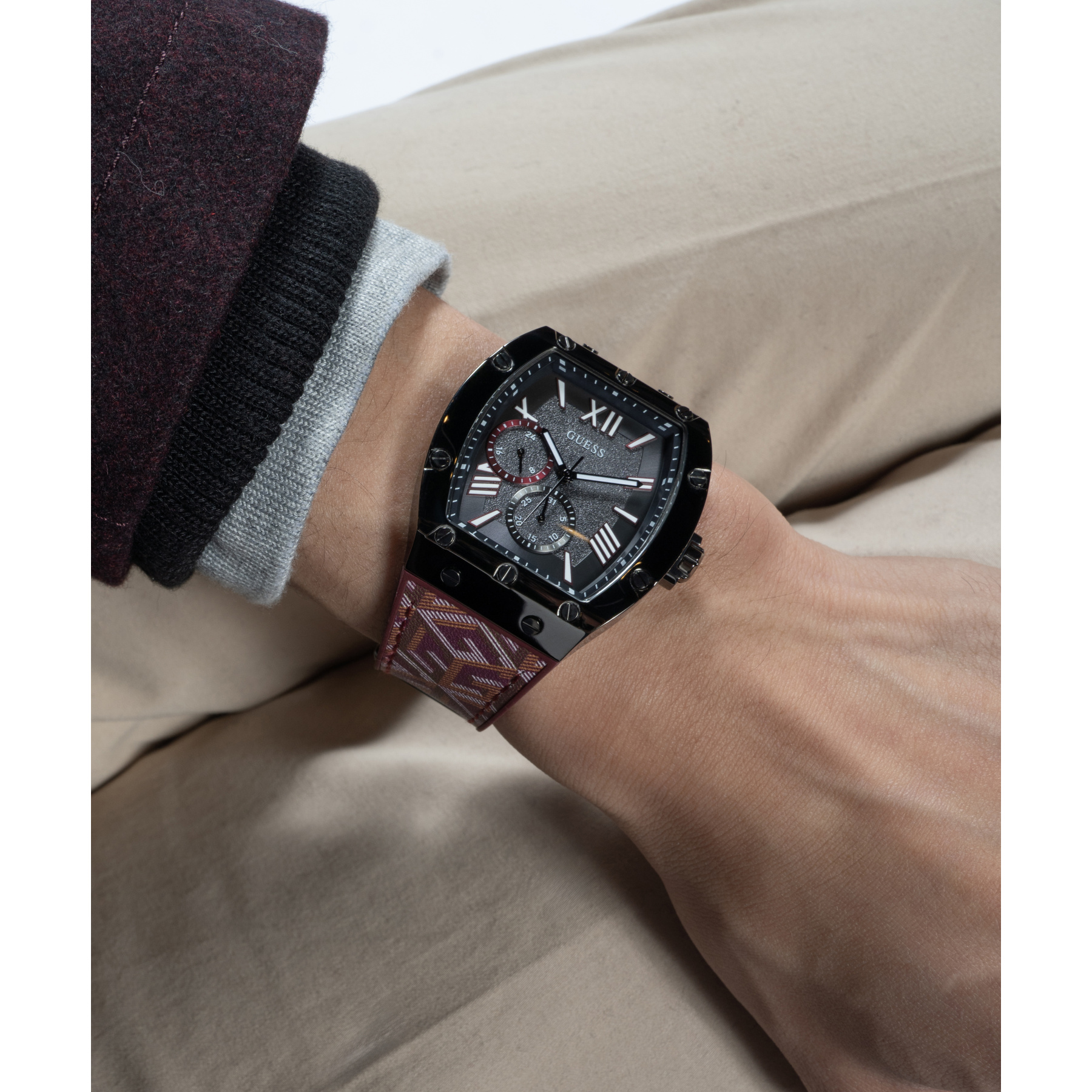 Чоловічий багатофункціональний годинник GUESS GW0645G4. Сталевий корпус оригінальної форми "бочка". Червоно-багряний з орнаментом ремінець з класичної застібкою пряжкою. Розмір корпусу - 43,5 мм. Чорний аналоговий циферблат. Мінеральне скло. Водозахист - 5 АТМ.