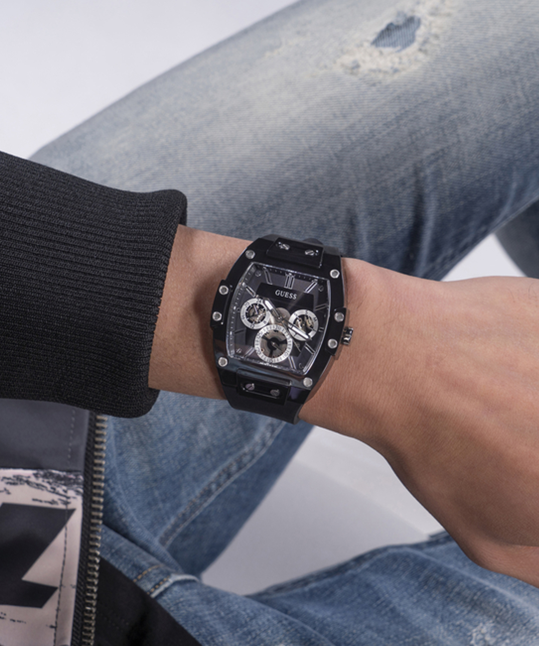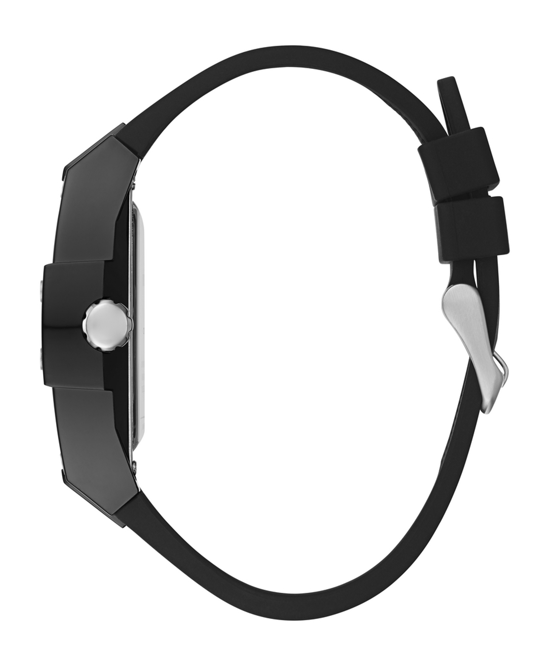 Стильний багатофункціональний годинник Guess з колекції - MENS TREND з якісним японським механізмом Miyota виготовлений з полікарбонату чорного кольору. На чорному циферблаті розміщені індикатори дати, дня тижня та часу в 24 годинному форматі. На безелі годинника ефектно виглядають декоративні заклепки, які поєднуються з мітками часу і міні циферблатами. Розмір корпусу – 43 х 45 мм. Силіконовий ремінець продовжує дзайнерську авангардну тему, стрілки та мітки з люмінесцентним покриттям світяться вночі, створюючи додатковий комфорт та зовнішню привабливість аксесуара.