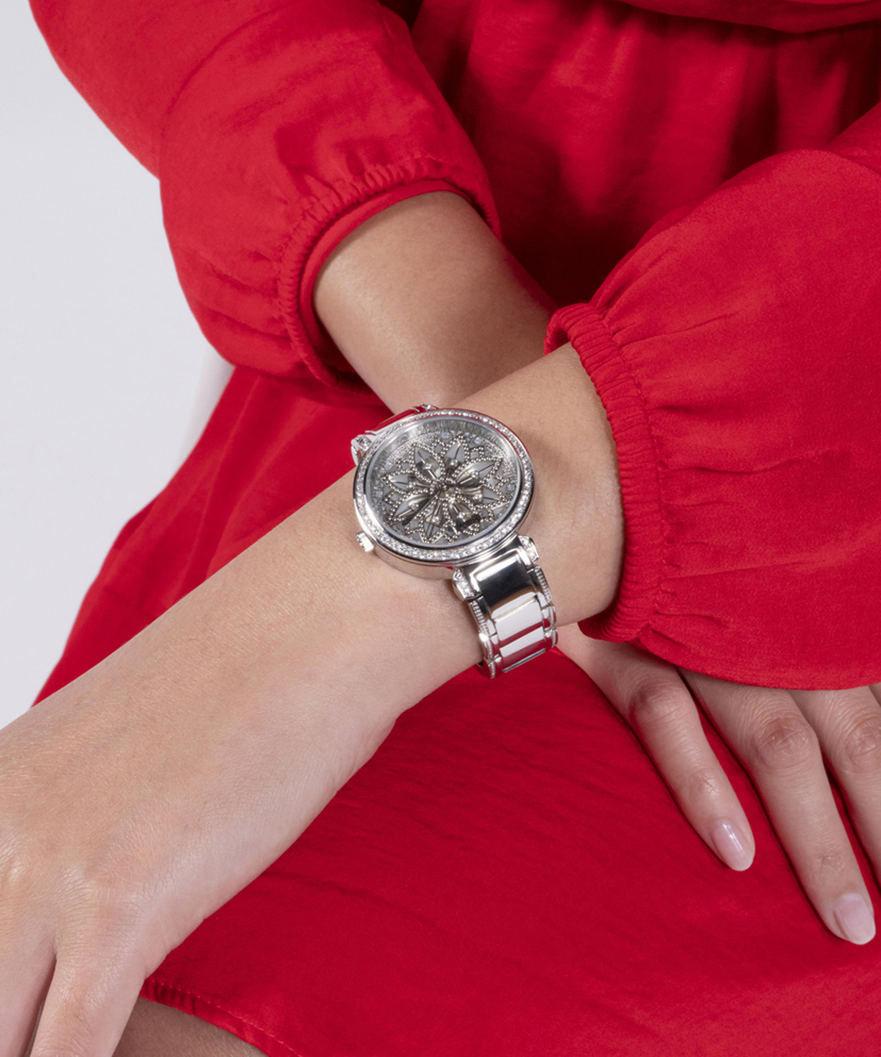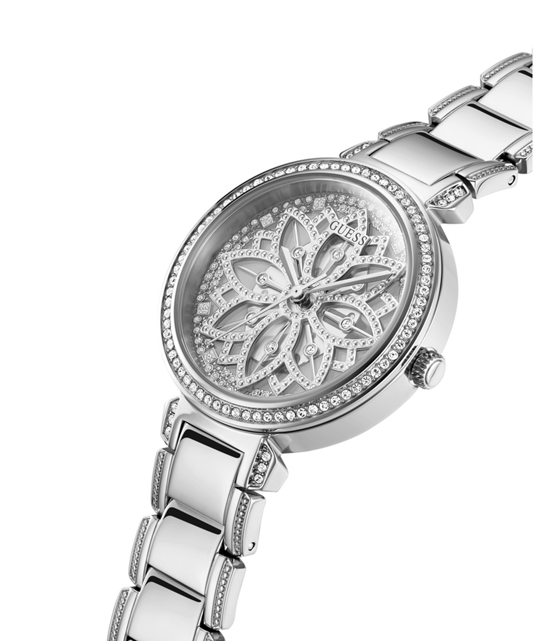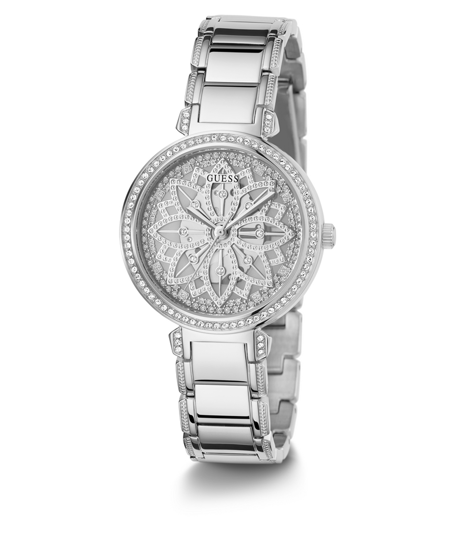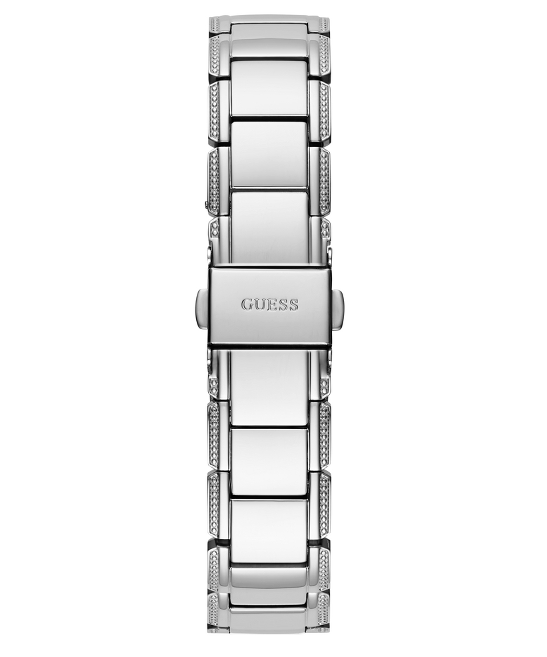 Оригінальний жіночий наручний годинник GW0528L1 відомого легендарного бренду GUESS. У годиннику встановлено надійний кварцовий механізм Miyota. Колекція - LADIES TREND. Сталеві корпус та браслет із покриттям Silver Tone. Діаметр корпусу – 36 мм, товщина – 9,25 мм. Браслет зі складаною кліпсою. Ширина кріплення – 18 мм. Безель прикрашений кристалами. Водозахист – 3 АТМ.