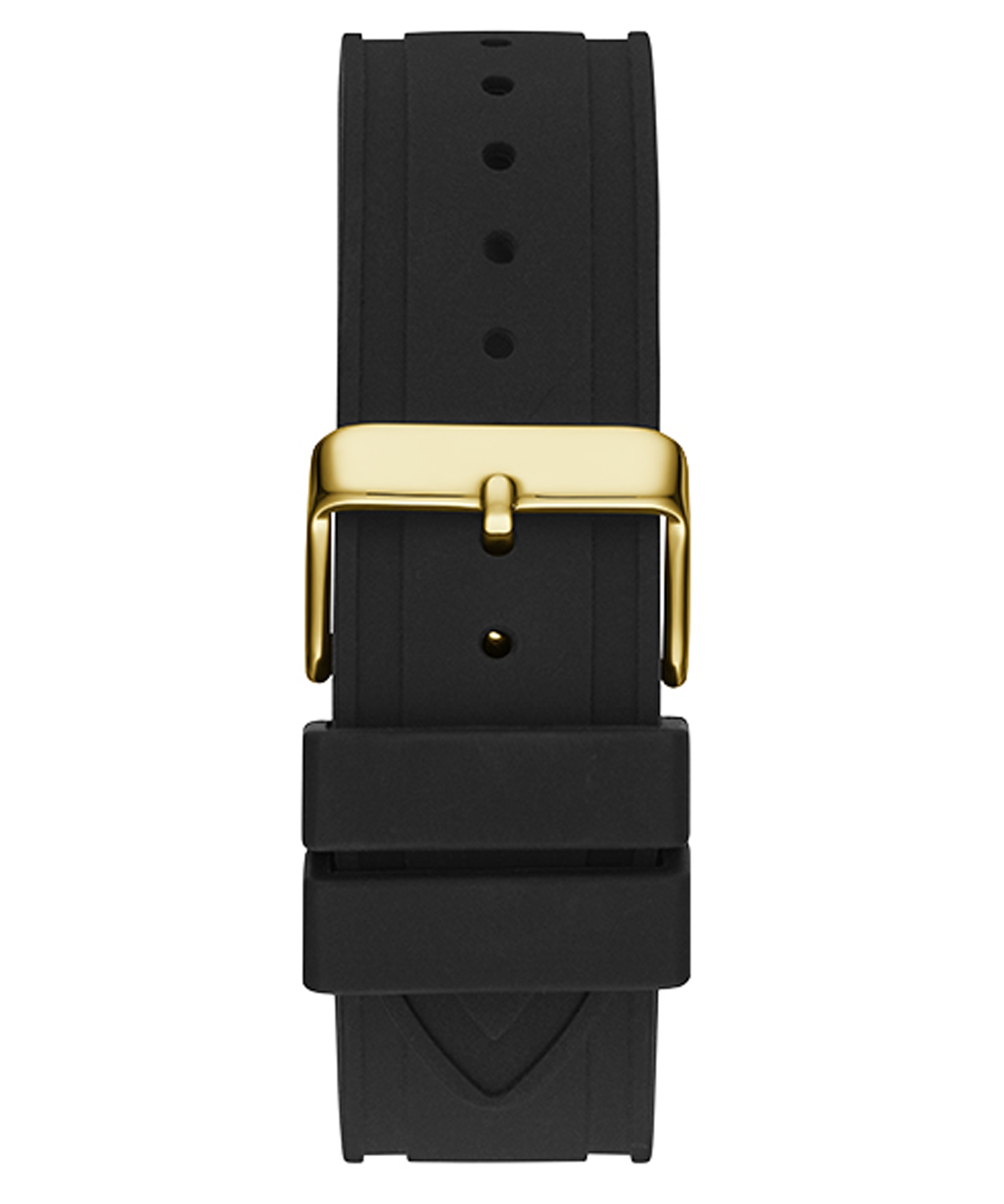 Розкішний чоловічий наручний годинник американського бренду GUESS. У годиннику встановлено надійний кварцовий механізм Miyota. Сталевий із покриттям Gold Tone корпус. Діаметр корпусу – 44 мм, товщина – 10,5 мм. Безель декорований кристалами. Чорний циферблат Sunray гармонійно поєднується із чорним силіконовим текстурним ремінцем. Ремінець, ширина кріплення якого становить 26 мм, оснащений класичною застібкою - пряжкою, що надійно фіксує аксесуар на руці. Додатково – відображення дати, дня тижня та часу у форматі 12/24. Водозахист 5 АТМ.