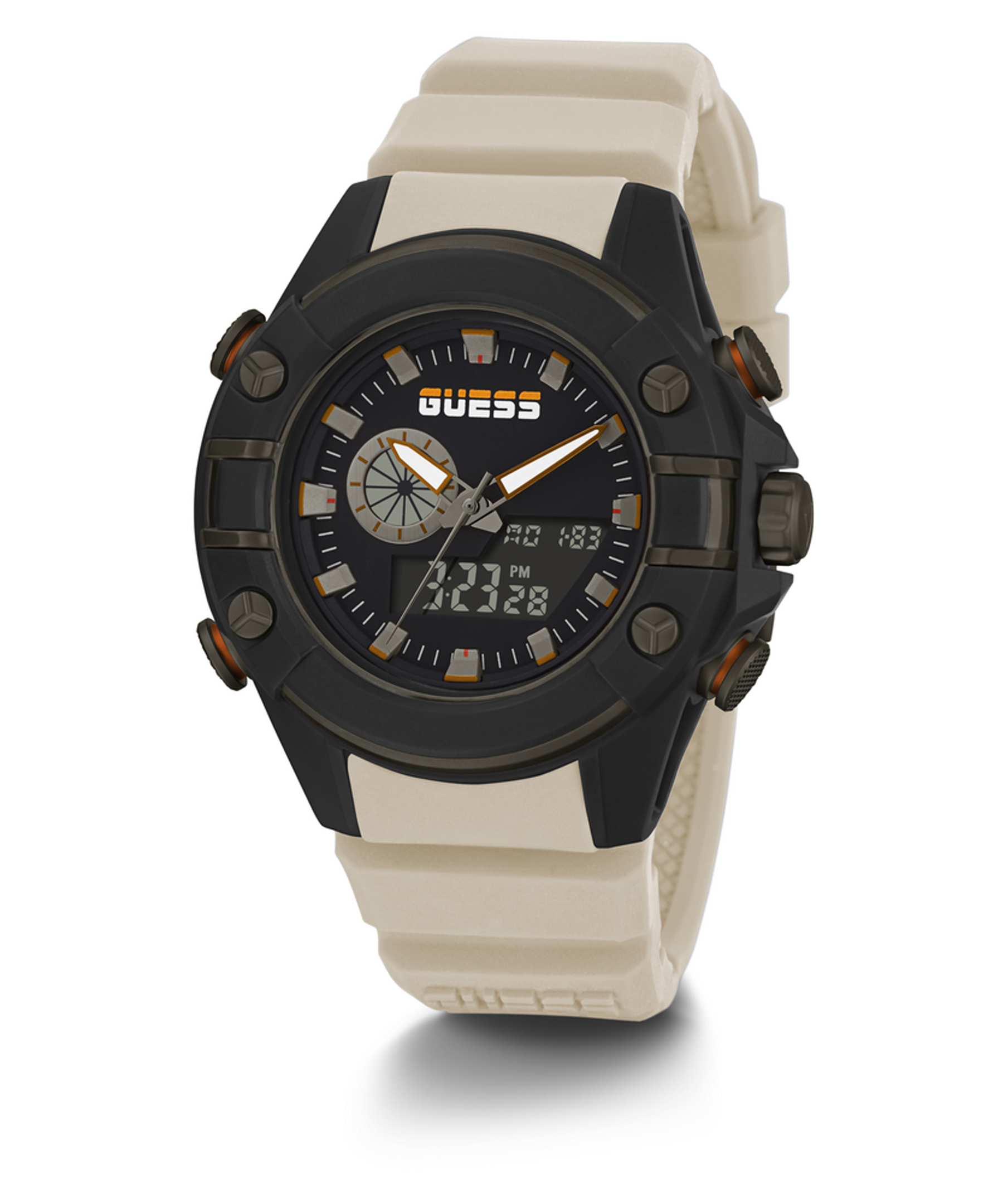 Авангардний чоловічий спортивний годинник відомого американського бренду GUESS з колекції Mens Sport виготовлені з чорного полікарбонату. Серцем годинника служитя японський кварцовий механізм Miyota, який заслужив взнання на світовому ринку. Відмінною особливістю годинника є подвійний тип індикації – аналоговий та цифровий. Особливий дзайн безелю та кнопок керування механізмом нагадує панель автомобіля, де розташовані датчики. Силіконовий ремінець із логотипом бренду контрастно підкреслює оригінальність рішення модельєрів бренду. Міцне мінеральне скло.Водозахист 5 АТМ. Надзвичайний комфорт пропонованої моделі не залишать байдужими поціновувачів статусних аксесуарів.