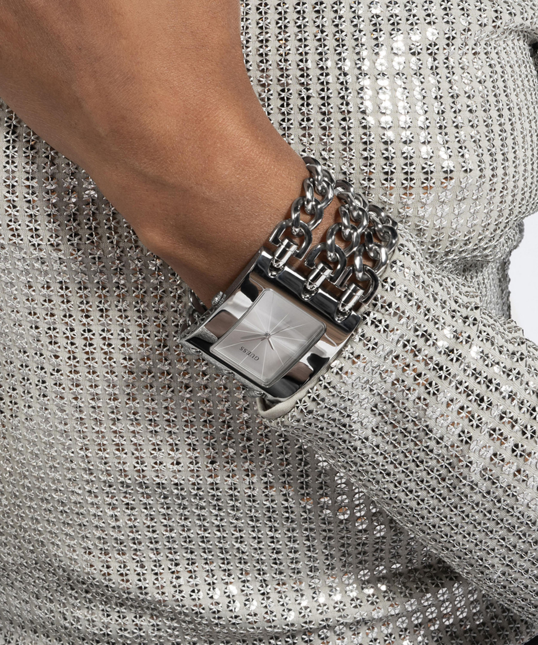 Надійний японський механізм та міцне мінеральне скло гарантують якість. На перламутровому циферблаті функцію міток часу виконують лінії, що нагадують промені сонця, а квадратний корпус і браслет з великих ланцюгів гармонійно виглядають на руці. Обираючи GUESS W1274L1 ви віддаєте перевагу якості та стриманому шику.