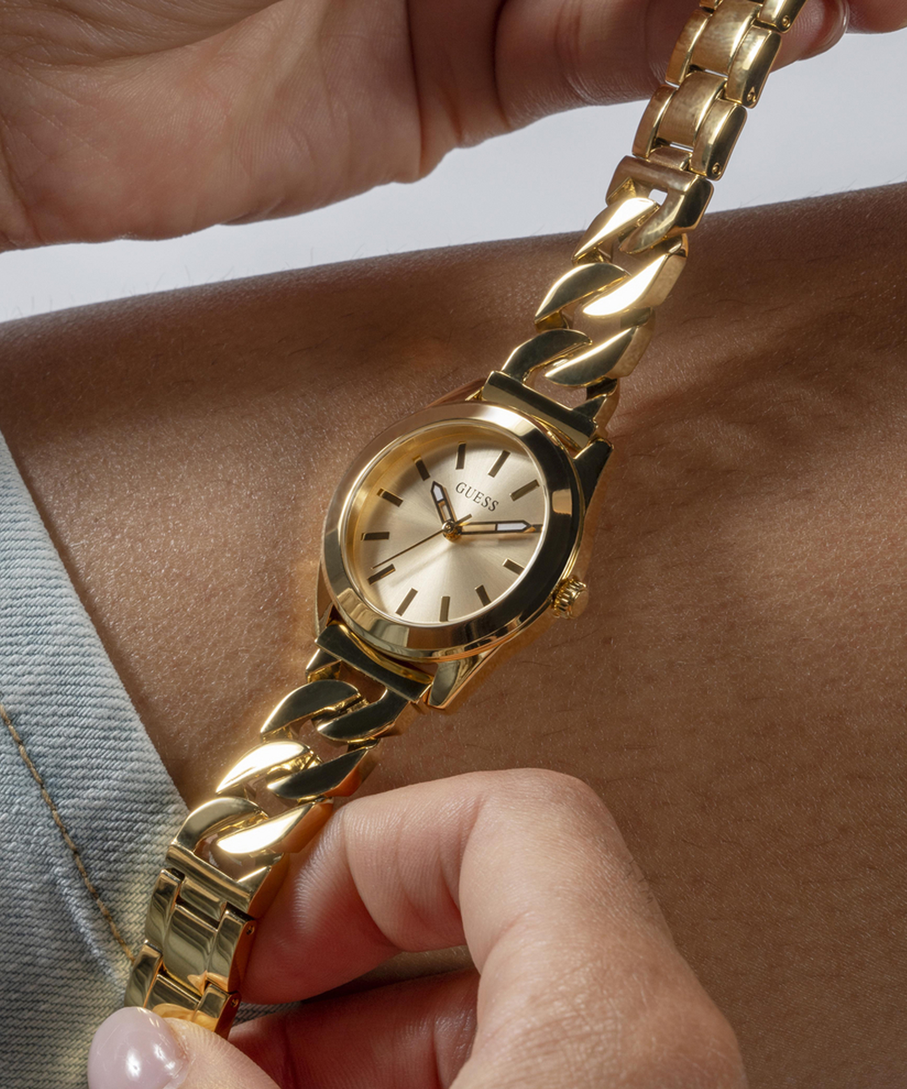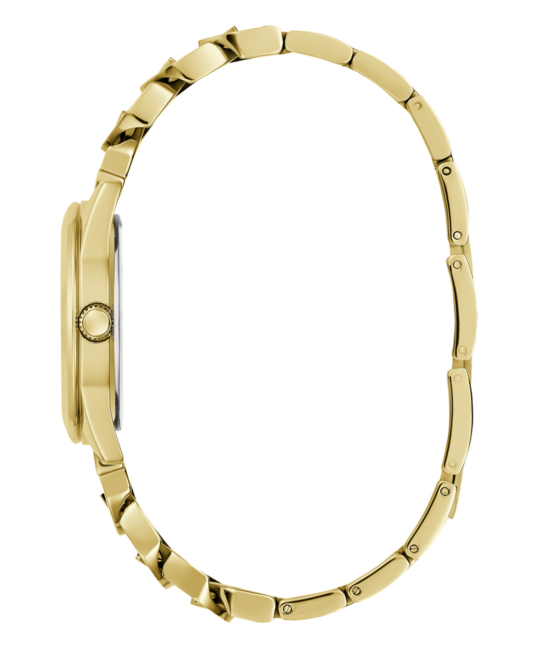 Лаконічний жіночий годинник GW0653L1 від всесвітньо відомого бренду GUESS. В годиннику встановлений надійний кварцовий механізм. Сталеві з золотистим PVD покриттям корпус та браслет. Діаметр корпусу - 32 мм, товщина - 8 мм. Ширина кріплення ремінця - 8 мм. Міцне мінеральне скло захищає механізм від пошкоджень. Водозахист - 3 АТМ.