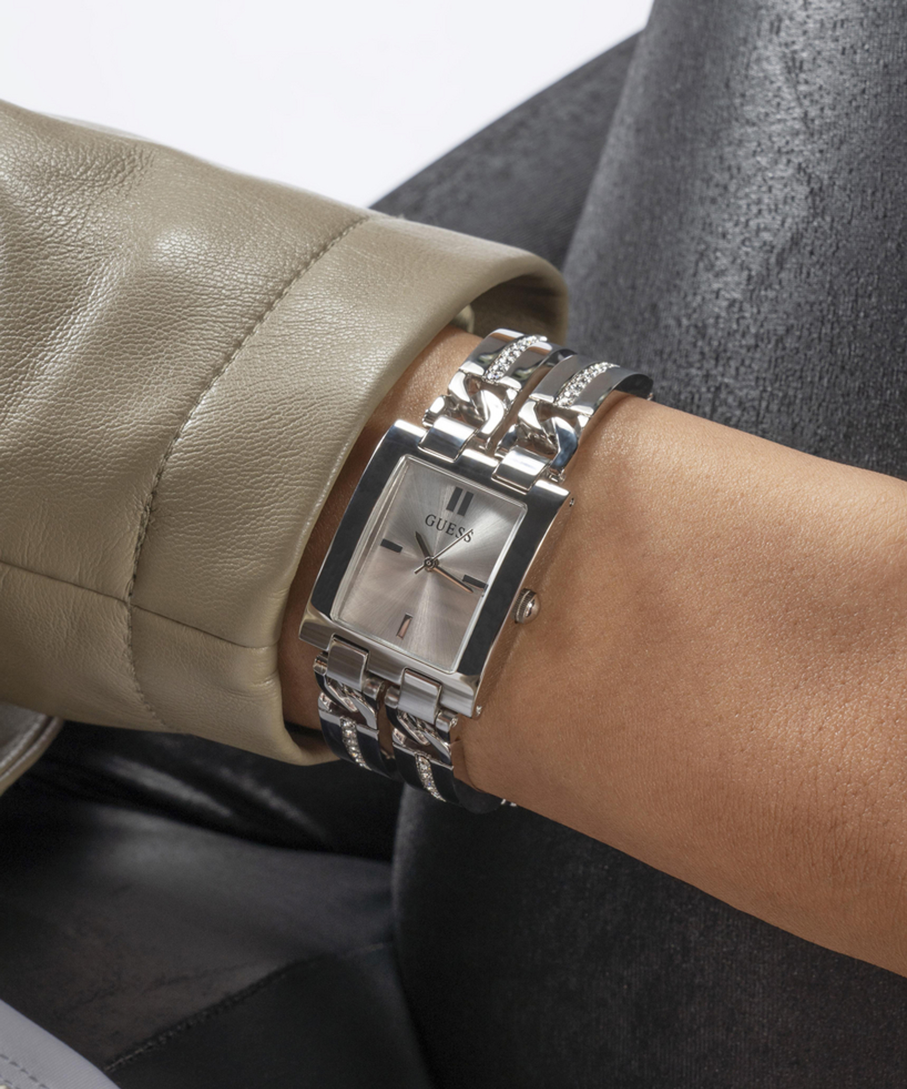 Модель оснащена точним кварцевим механізмом Miyota, що забезпечує бездоганну роботу упродовж тривалого часу. Корпус та браслет виготовлені з нержавіючої сталі, що додає витонченості та довговічності виробу. Прямокутний корпус розміром 24 мм виглядає вишукано на зап’ясті, а сріблястий аналоговий циферблат підкреслює лаконічну естетику моделі. Мінеральне скло стійке до подряпин, а водозахист 3 ATM дозволяє не турбуватись про випадкові краплі води.