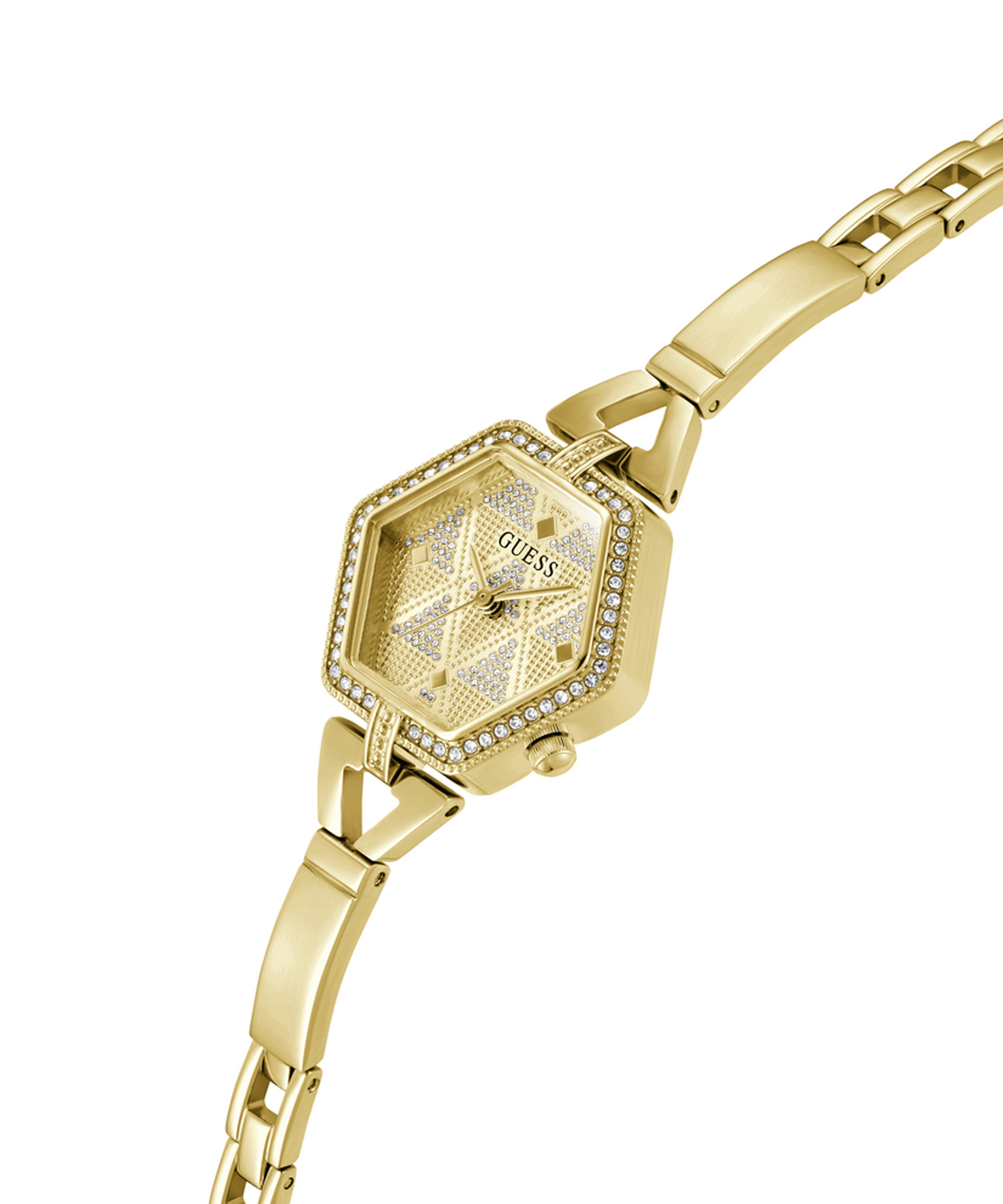 Розкішний годинник жіночий GW0680L2 американського бренду GUESS. Нестандартний дизайн, надійність кварцевого механізму Miyota та практичність поєднані у одному аксесуарі. Сталеві з золотистим покриттям корпус та браслет. Розмір корпусу - 28 х 28 мм. Безель прикрашений мерехтливими кристалами. Анаоговий циферблат кольору "шампань" захищений мінеральним склом. Водозахист годинника - 3 АТМ.
