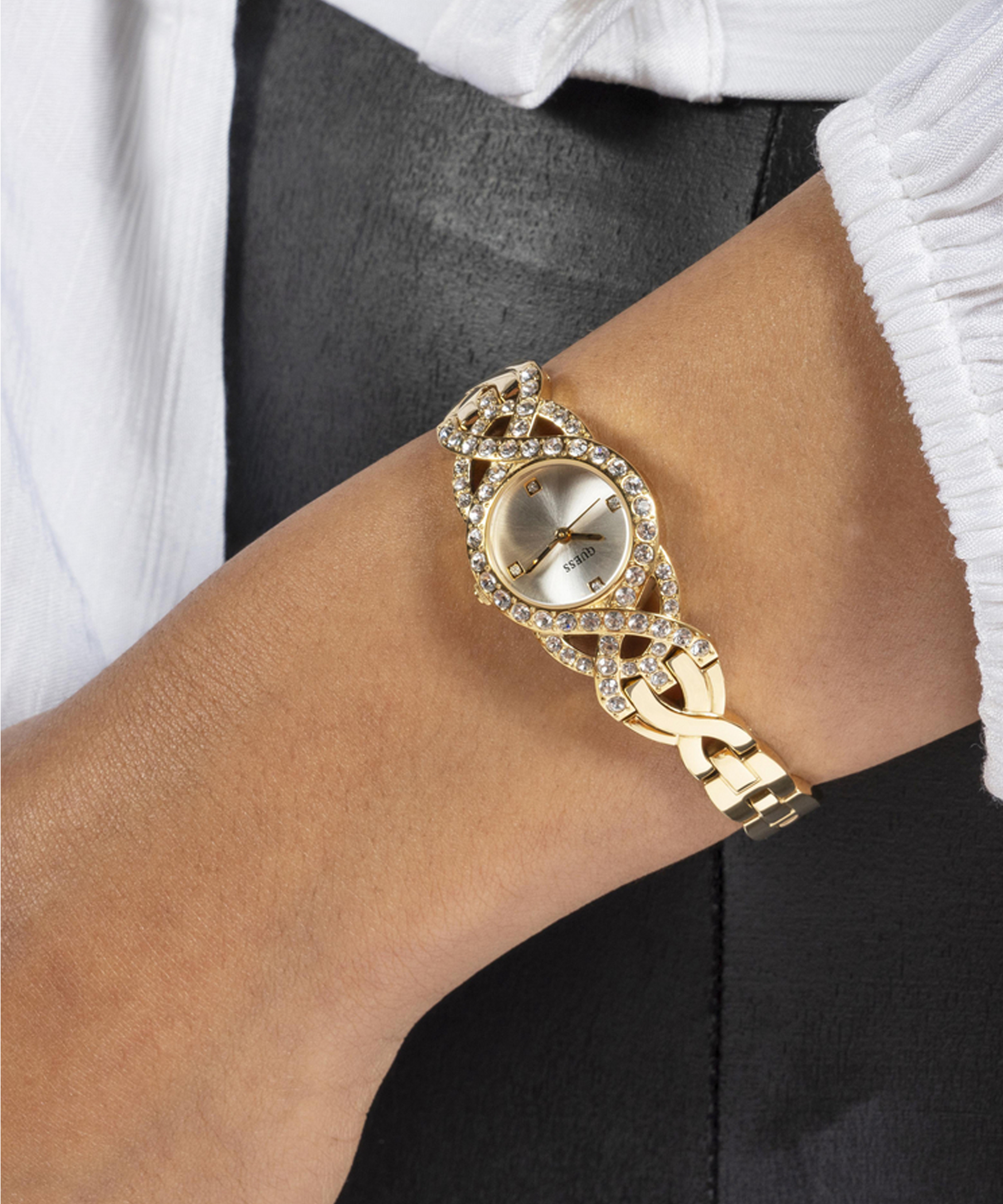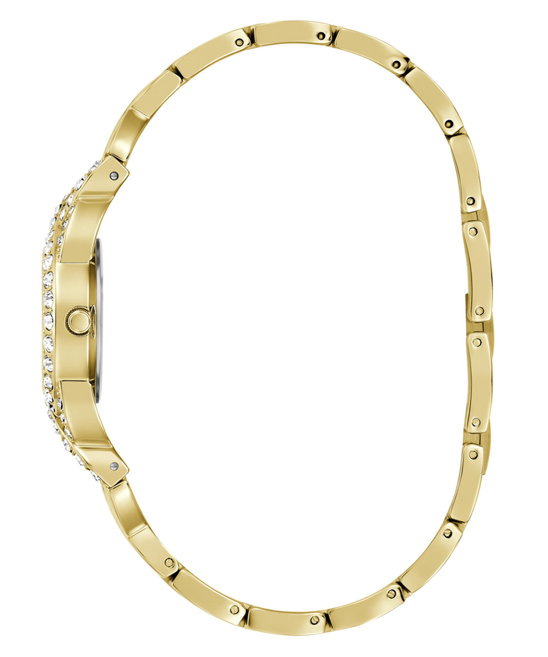 Надзвичайно жіночний дизайн втілений у новій моделі годинника GW0682L2 американського бренду GUESS. В годиннику встановлений надійний японський механізм Miyota. Сталеві з золотистим покриттям корпус та браслет. Нестандартний дизайн, надійність кварцевого механізму Miyota та практичність поєднані у одному аксесуарі, котрий може служити своїй власниці як самостійна ювелірна прикраса. Діаметр корпусу - 23 мм. Сріблястий аналоговий циферблат захищений міцним мінеральним склом. Водозахист 1 АТМ.