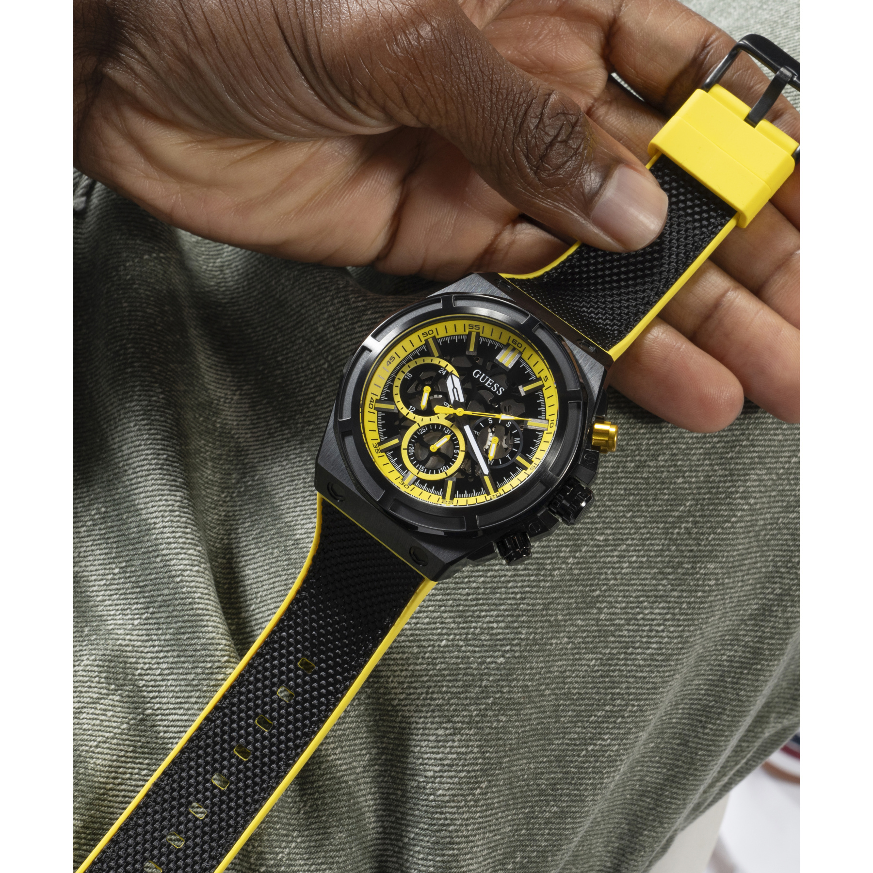 Спортивний годинник GW0713G2 американського бренду GUESS - вибір чоловіків, котрі віддають перевагу активному образу життя! Функціональність, дизайн та надійність втілені у одному аксесуарі. Кварцовий механізм Мійота славиться своєю надійністю та довговічністю. Поєднання чорного та жовтого кольорів акцентують увагу на деталях годинника. Мінеральне скло захищає аналоговий циферблат від пошкоджень. Діаметр корпуса 47 мм. Водозахист - 5 АТМ.-