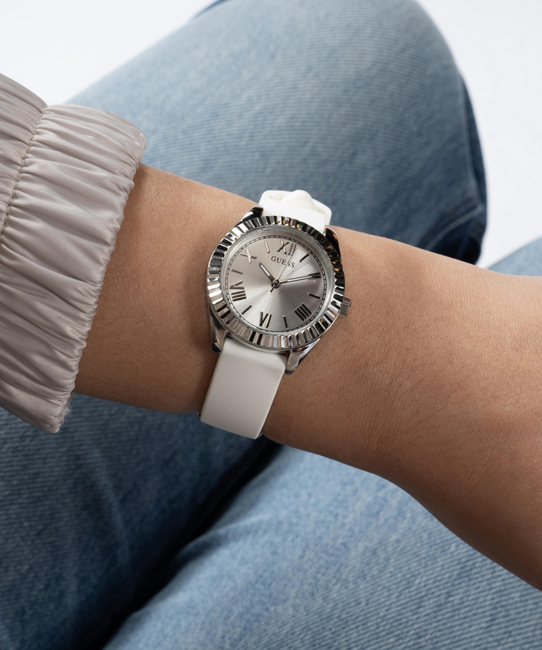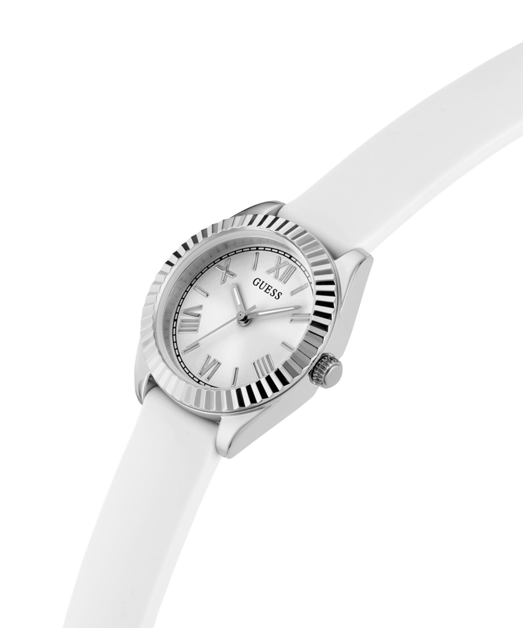Оигінальний жіночий годинник американського бренду GUESS. В годиннику встановлений надійний японський механізм Miyota. Сталевий корпус та силіконовий ремінець білого кольору. Діаметр корпусу - 30 мм. Рельєфний безель. Міцне мінеральне скло стійке до подряпин та пошкоджень. Водозахист - 3 АТМ.