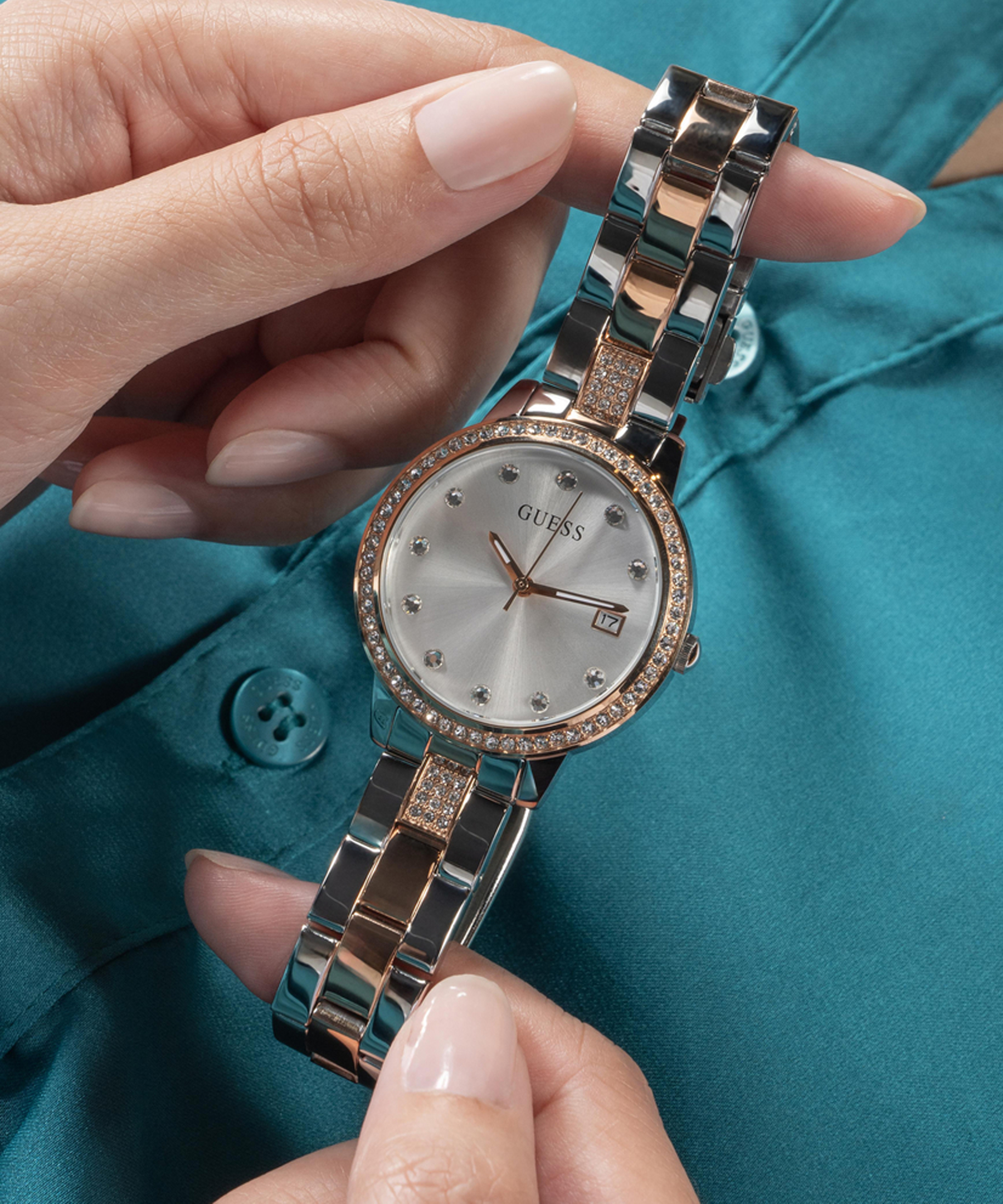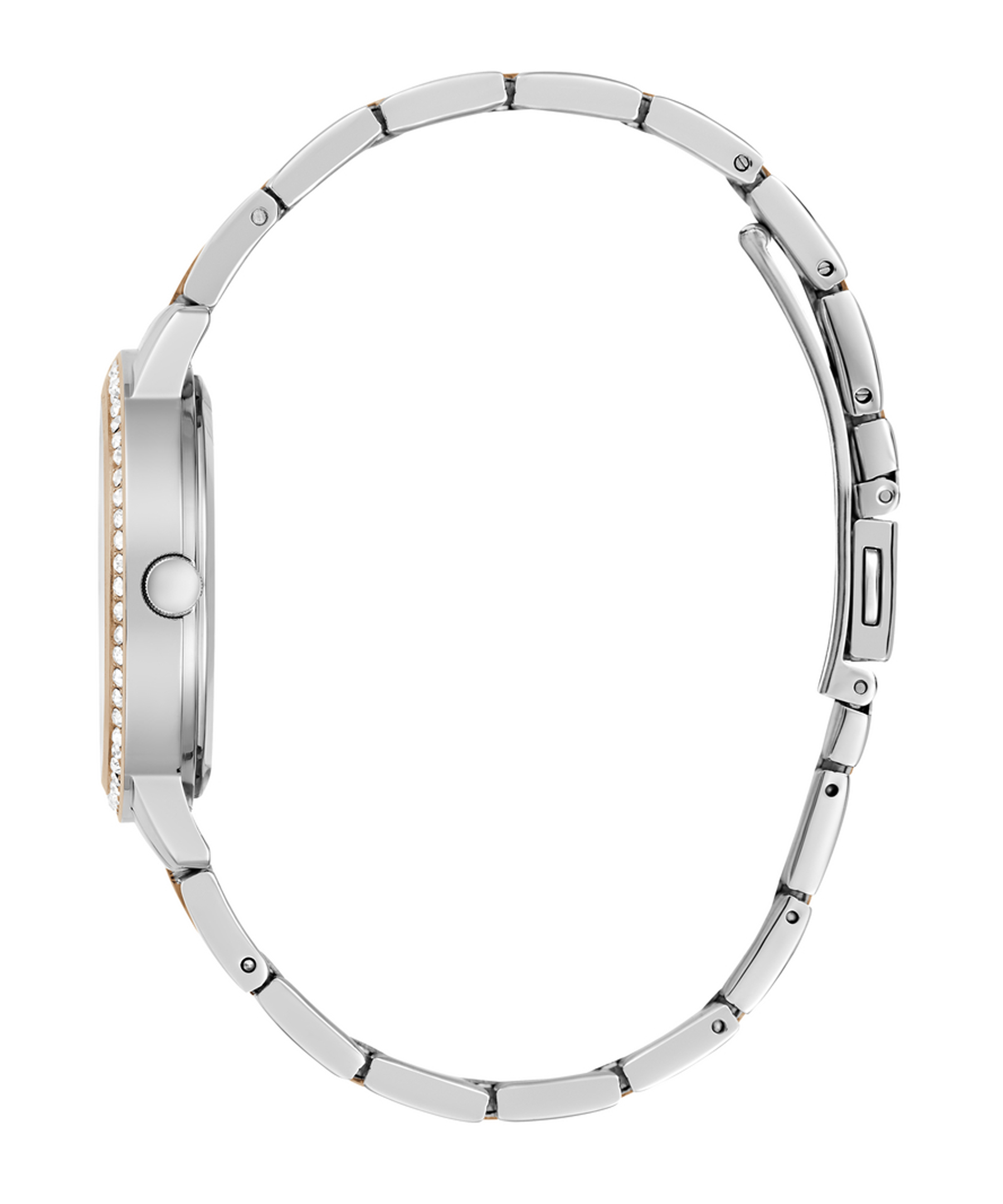Оригінальний жіночий годинник GESS поєднує у собі ніжний витончений дизайн та функціональність і практичність японського кварцового механізму. Сталеві корпус та браслет з частковим PVD покриттям Rose Gold. Діаметр корпусу 34мм. Безель прикрашений мерехтливим камінням, котре ніби перегукуєтсья з мітками часу. Циферблат годинника захищений міцним мінеральним склом. Водозахист 3 АТМ.