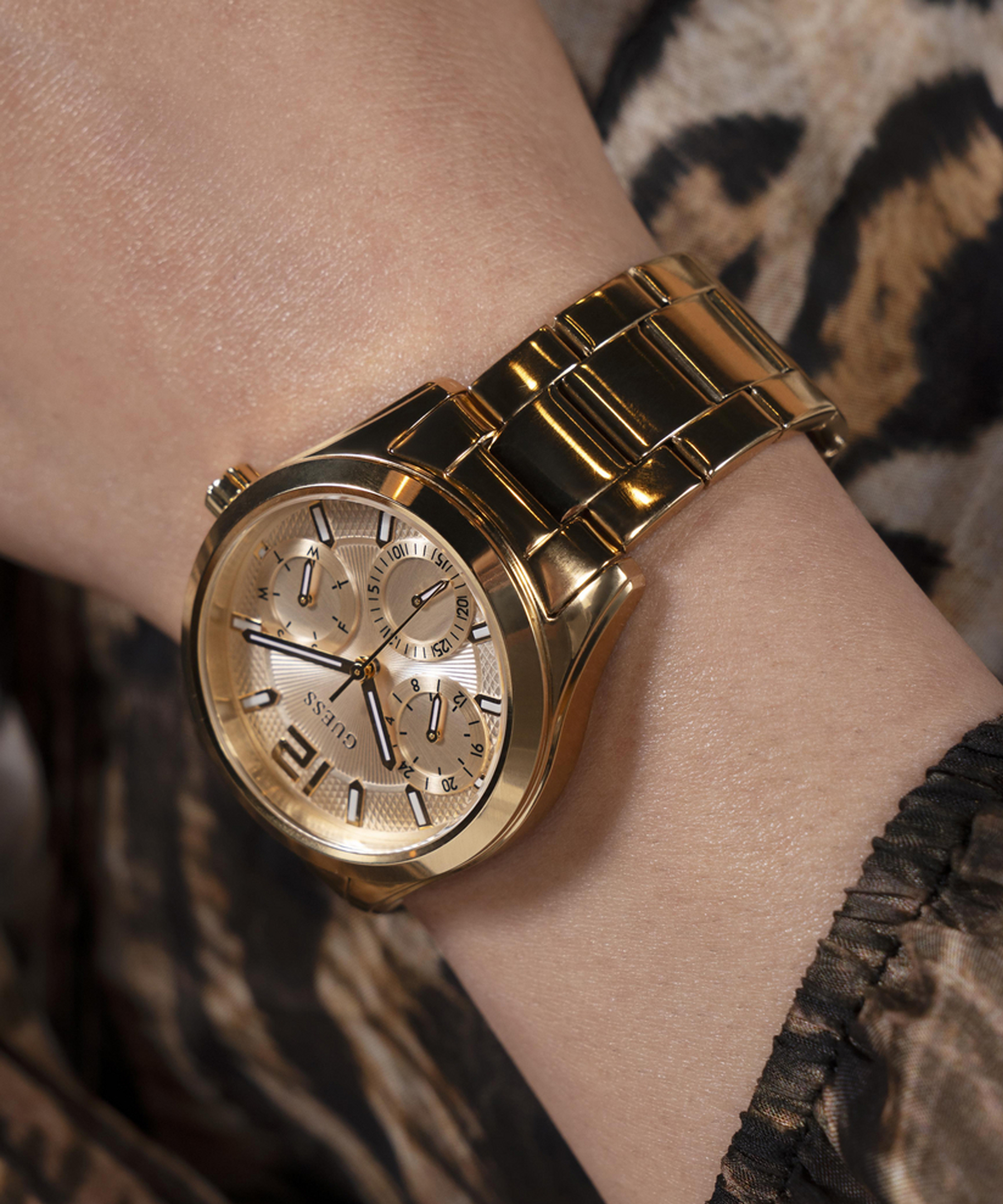 Оригінальний жіночий годинник GUESS з надійним кварцевим механізмом Miyota. Сталевий корпус і браслет з PVD покриттям Gold. Діаметр корпусу 38 мм. Міцне мінеральне скло захищає циферблат, а водозахист 3 АТМ робить його зручним для щоденного використання. Цей годинник стане ідеальним доповненням вашого стильного образу.