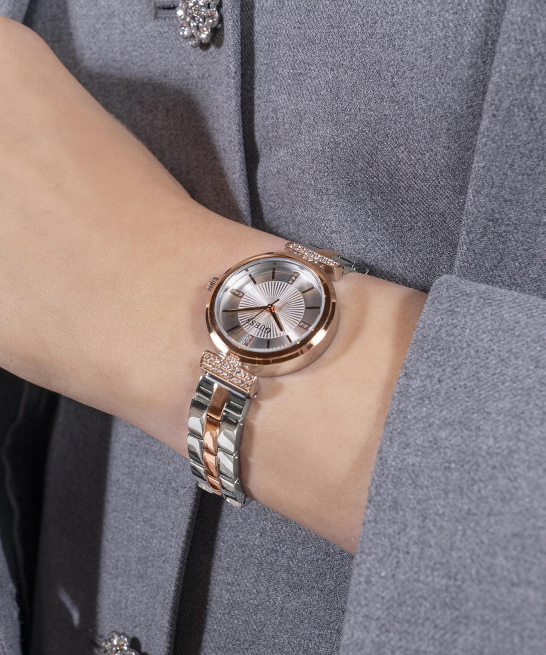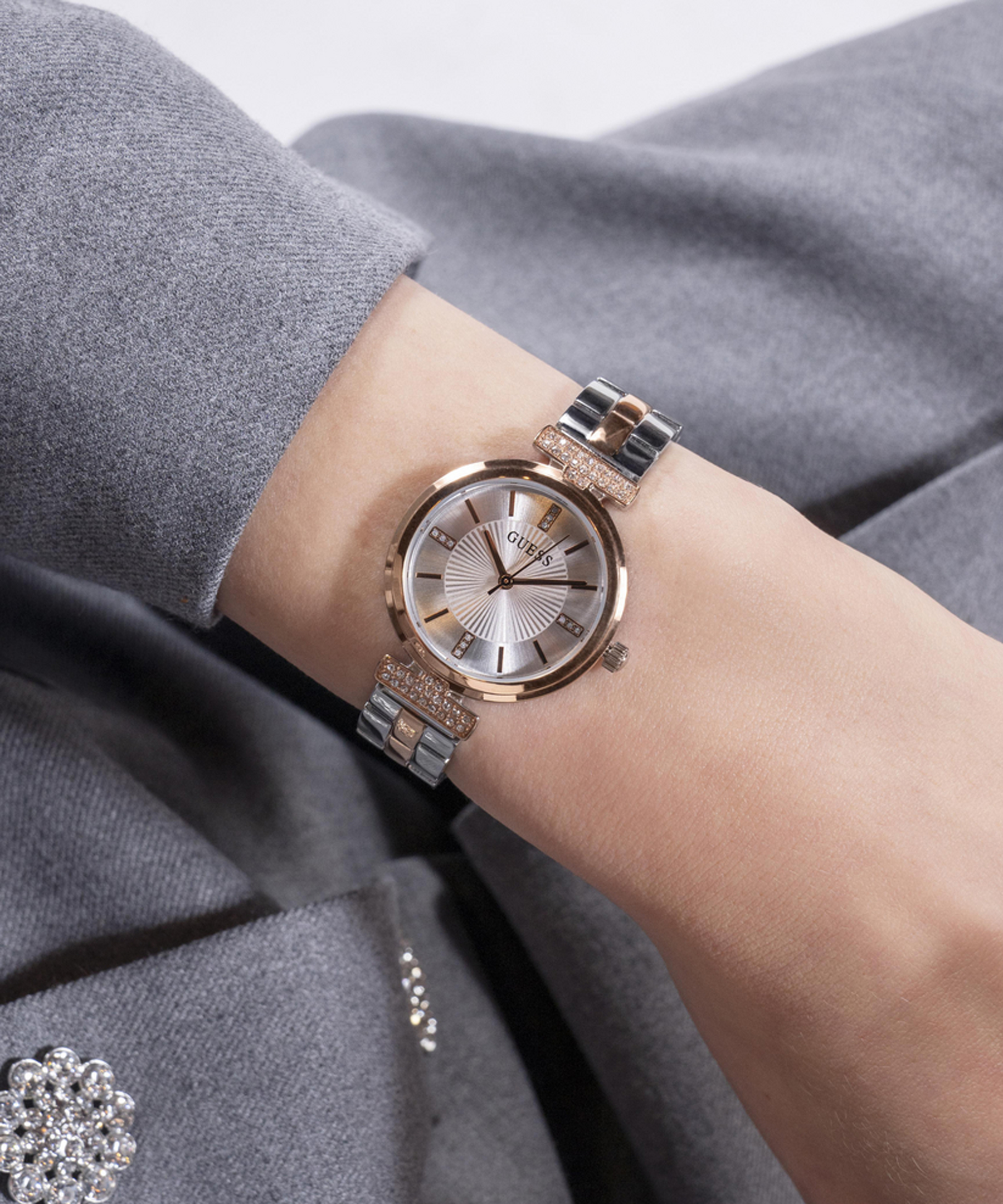 Елегантний та стильний жіночий годинник Guess — це справжній витвір мистецтва, що поєднує витонченість дизайну і точність японського кварцового механізму. Сталевий корпус і браслет з частковим покриттям Rose Gold створюють ефектний контраст і додають годиннику розкоші. Діаметр корпусу 28 мм ідеально підійде для тонкої жіночої руки. Мінеральне скло захищає циферблат від пошкоджень, а водозахист 3 АТМ робить годинник практичним для повсякденного носіння.