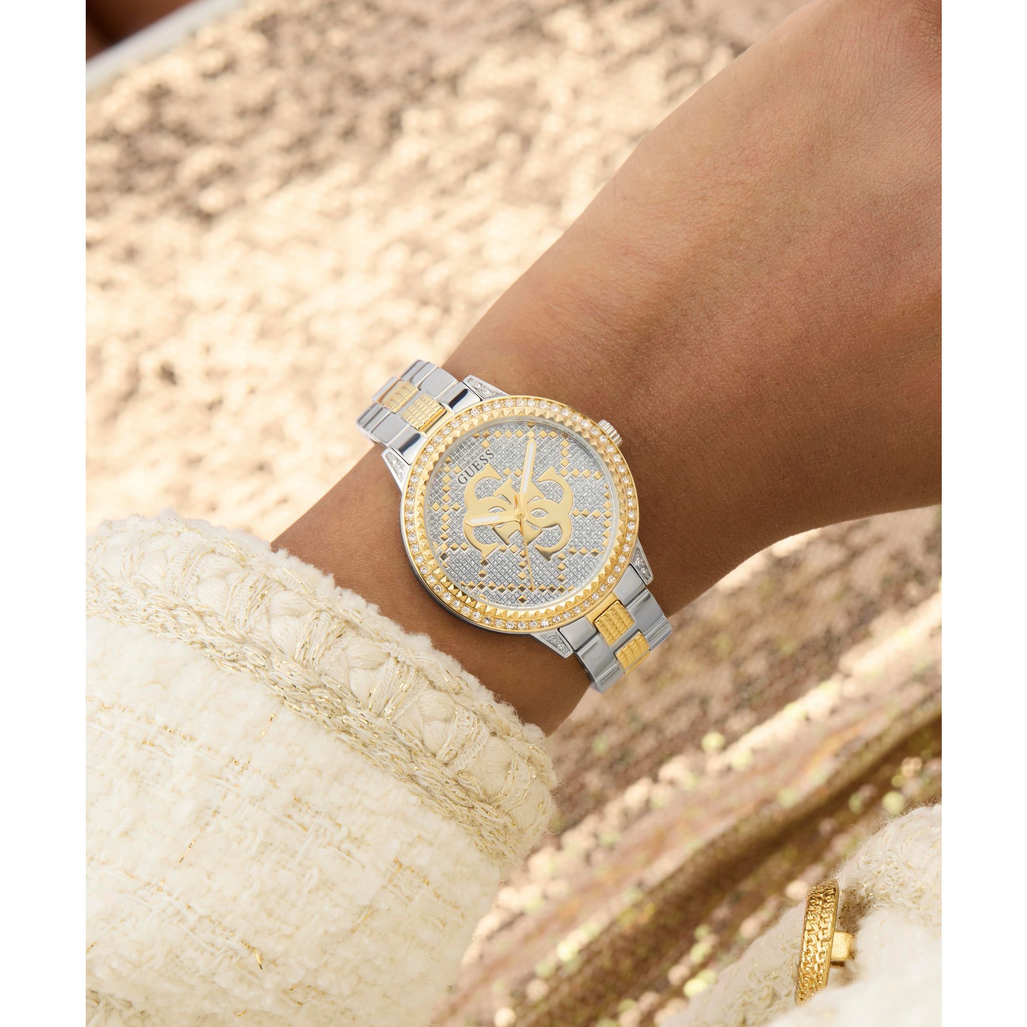 Жіночий годинник GUESS у двоколірному виконанні поєднує елегантність і виразність. Круглий корпус 34 мм із кристалами на безелі і полірований браслет створюють сяючий та вишуканий образ, а золотий логотип Quattro 'G' на циферблаті додає яскравий акцент.