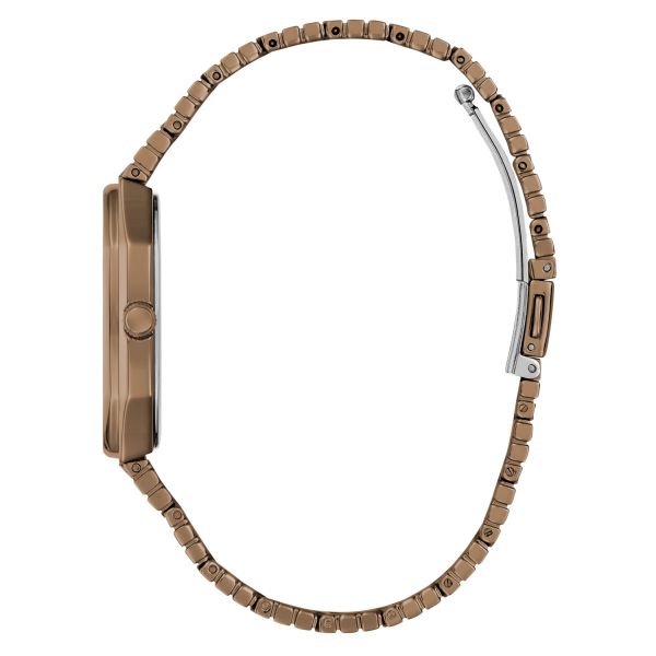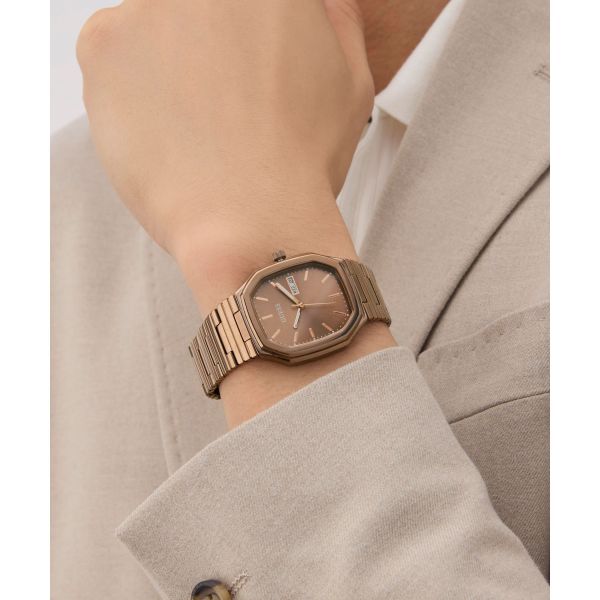 🔹 Корпус: прямокутний, 38 × 35 мм, у кавовому тоні з полірованої переробленої сталі.