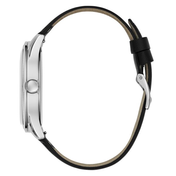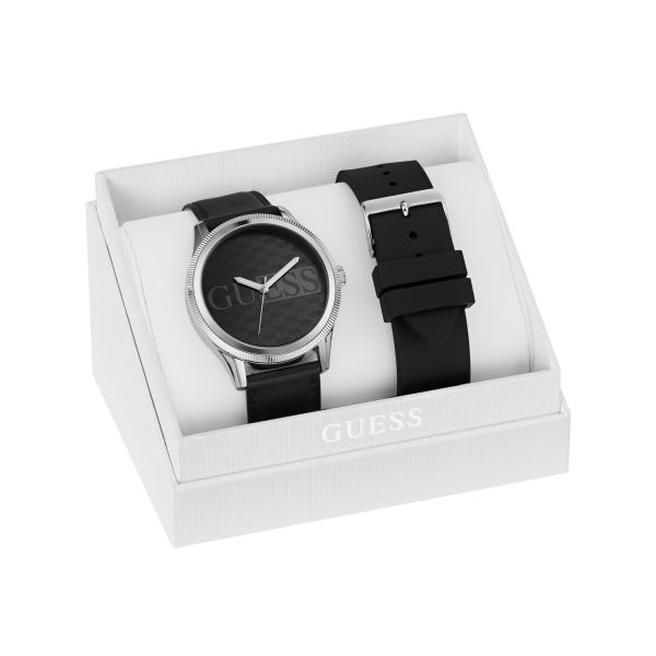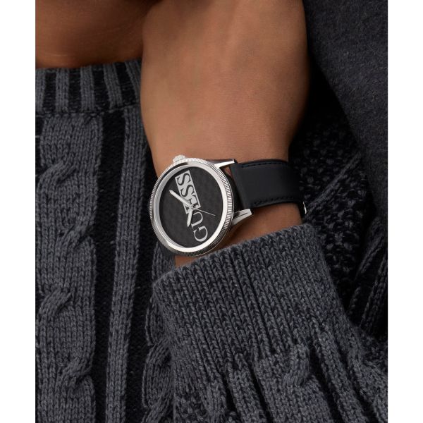 Цей набір від GUESS поєднує універсальність та характерний логотипний дизайн. Годинник має 44 мм круглий корпус у сріблястому тоні з полірованої переробленої сталі та унікальну текстуру. Чорний циферблат із логотипом GUESS створює яскравий акцент у будь-якому образі.