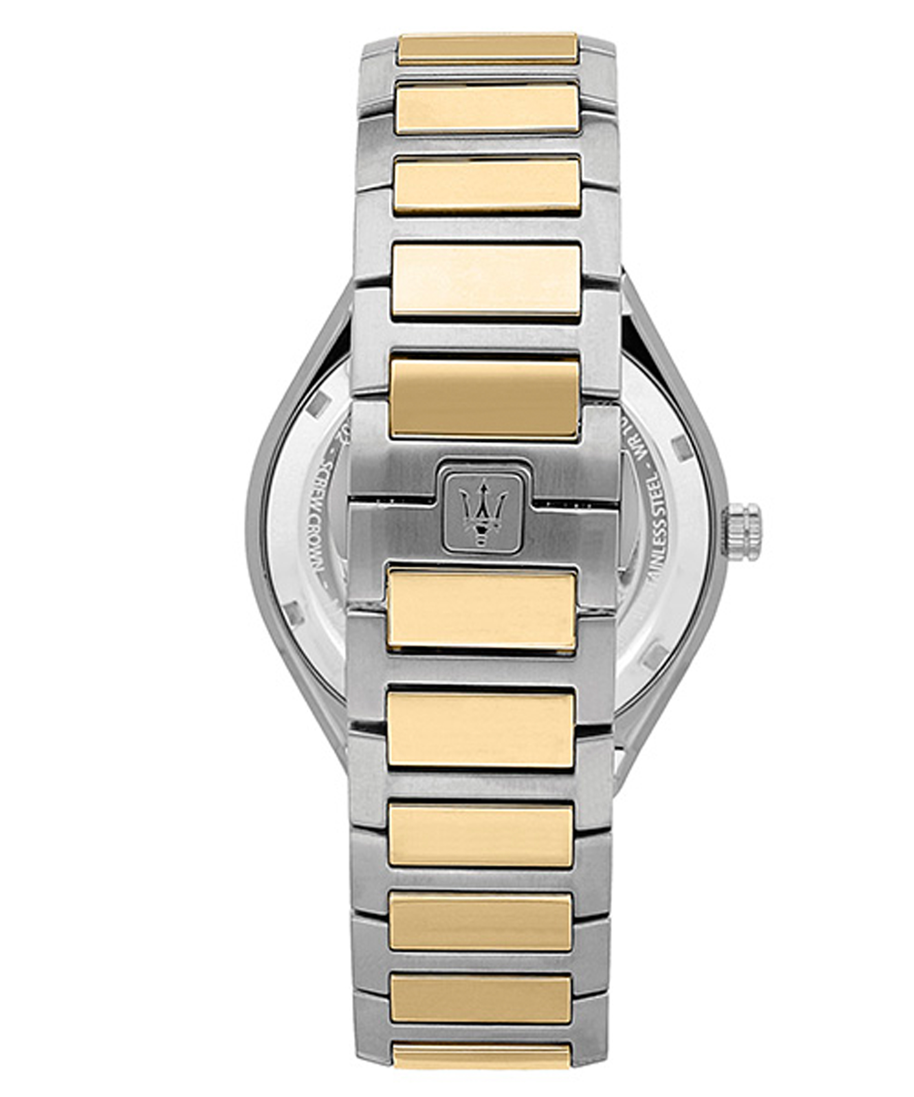 Чоловічий наручний годинник Maserati R8853142007 з встановленим кварцовим механізмом. Стальний корпус діаметром 45 мм. Браслет із комбінованим золотисто-срібним покриттям. Додатково на блакитному циферблаті відображення дати. Водозахист: 10 АТМ. Мінеральне скло.
