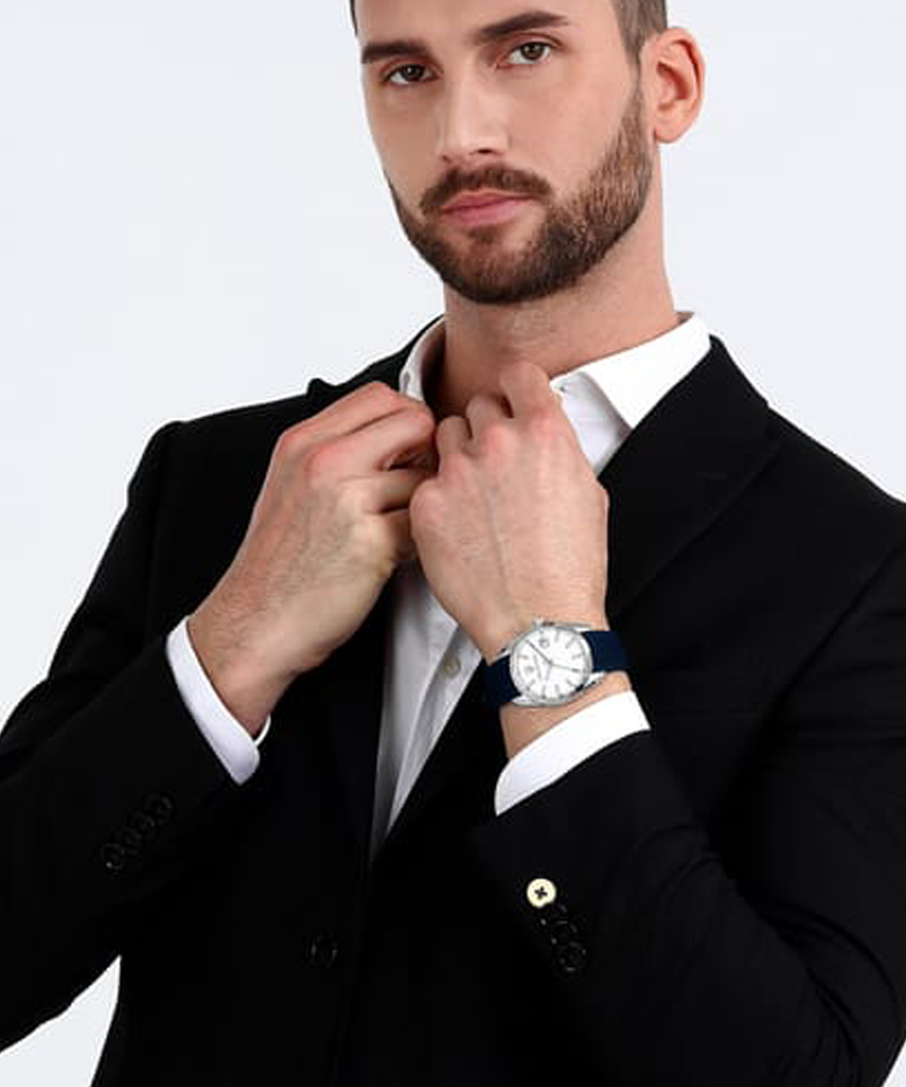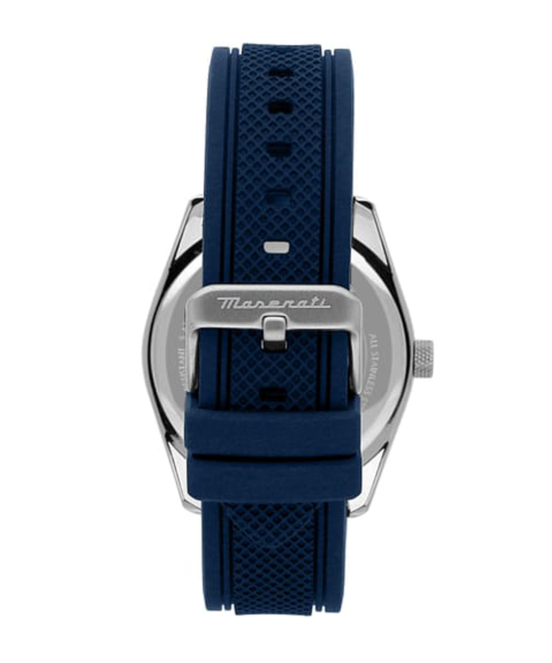 Масивний сталевий корпус діаметром 43 мм і товщиною 10,75 мм створює яскравий акцент на зап’ясті, підкреслюючи характер і впевненість свого власника. Контрастний синій силіконовий ремінець із класичною застібкою-пряжкою додає спортивної динаміки та зручності у щоденному носінні.