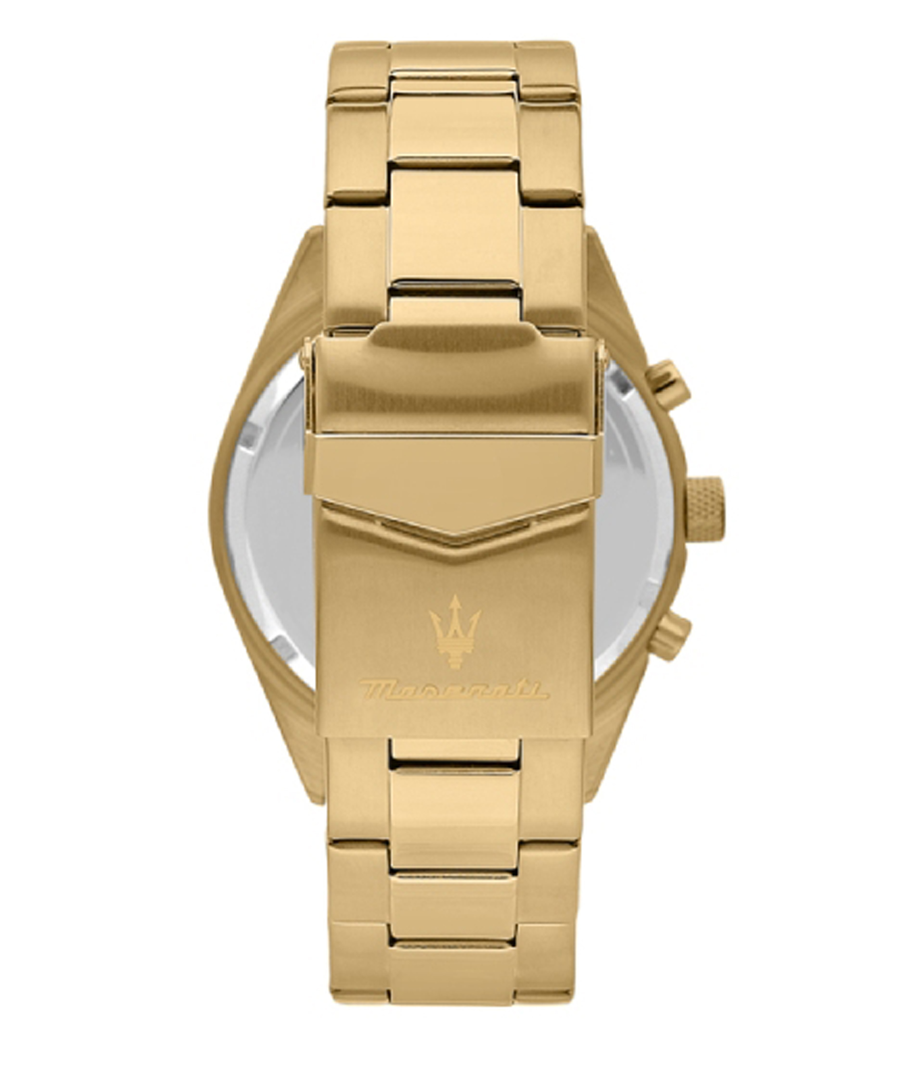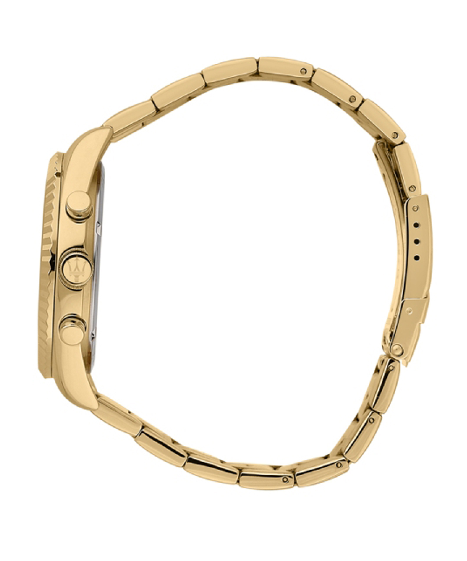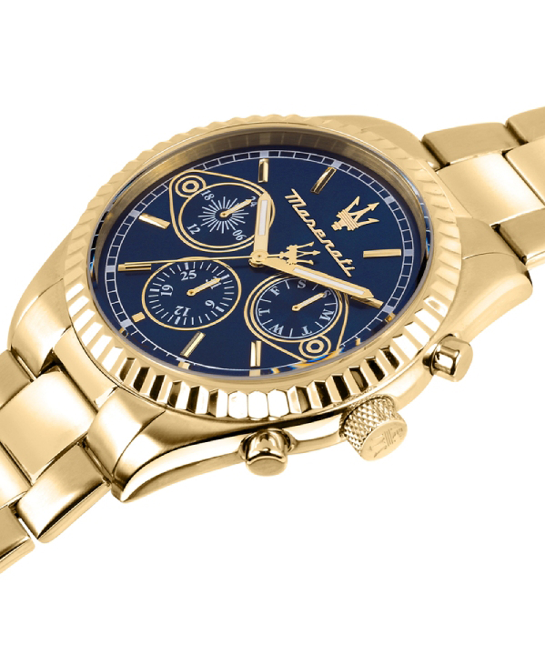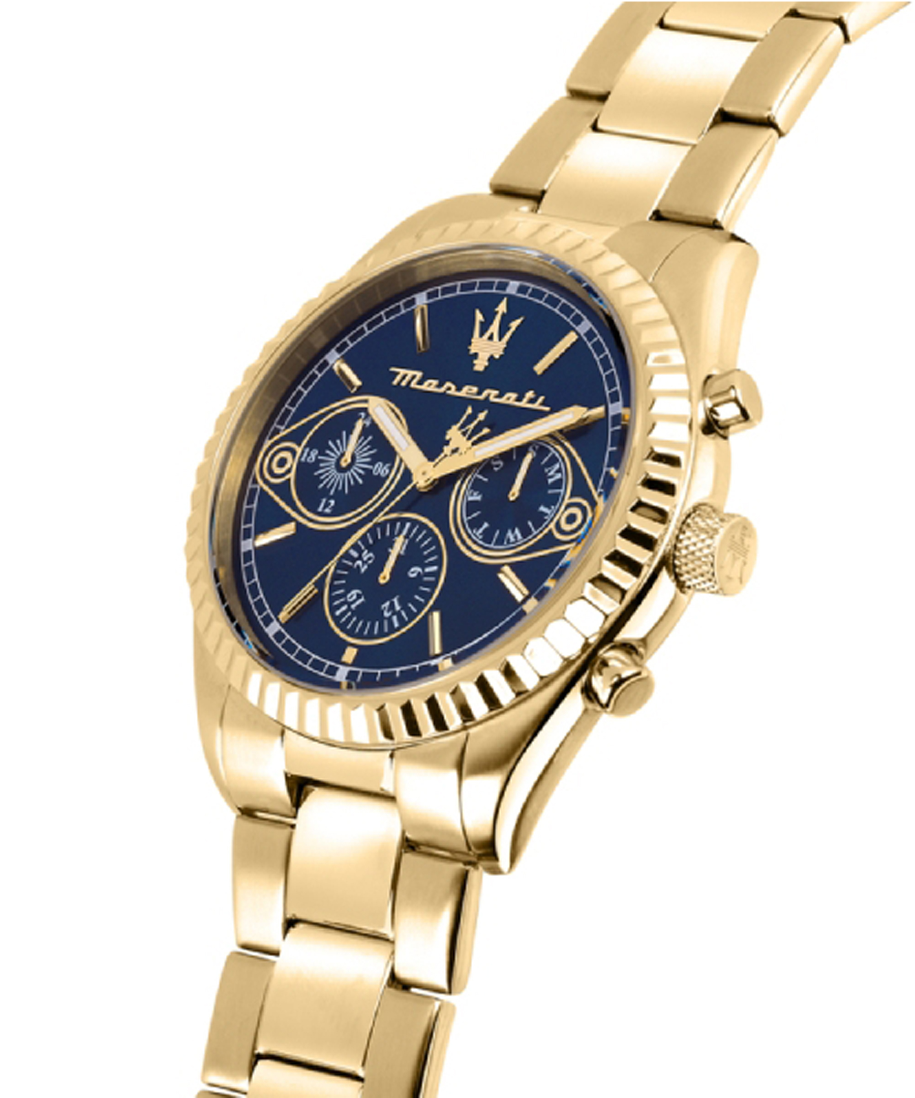 Чоловічий наручний годинник MASERATI R8853100026 з колекції COMPETIZIONE. В годиннику встановлений надійний кварцовий механізм. Сталеві з золотистим покриттям корпус та браслет. Діаметр корпусу - 42 мм, товщина - 10 мм. Аналоговий циферблат синього кольору захищений міцним мінеральним склом. Водозахист - 10 АТМ.
