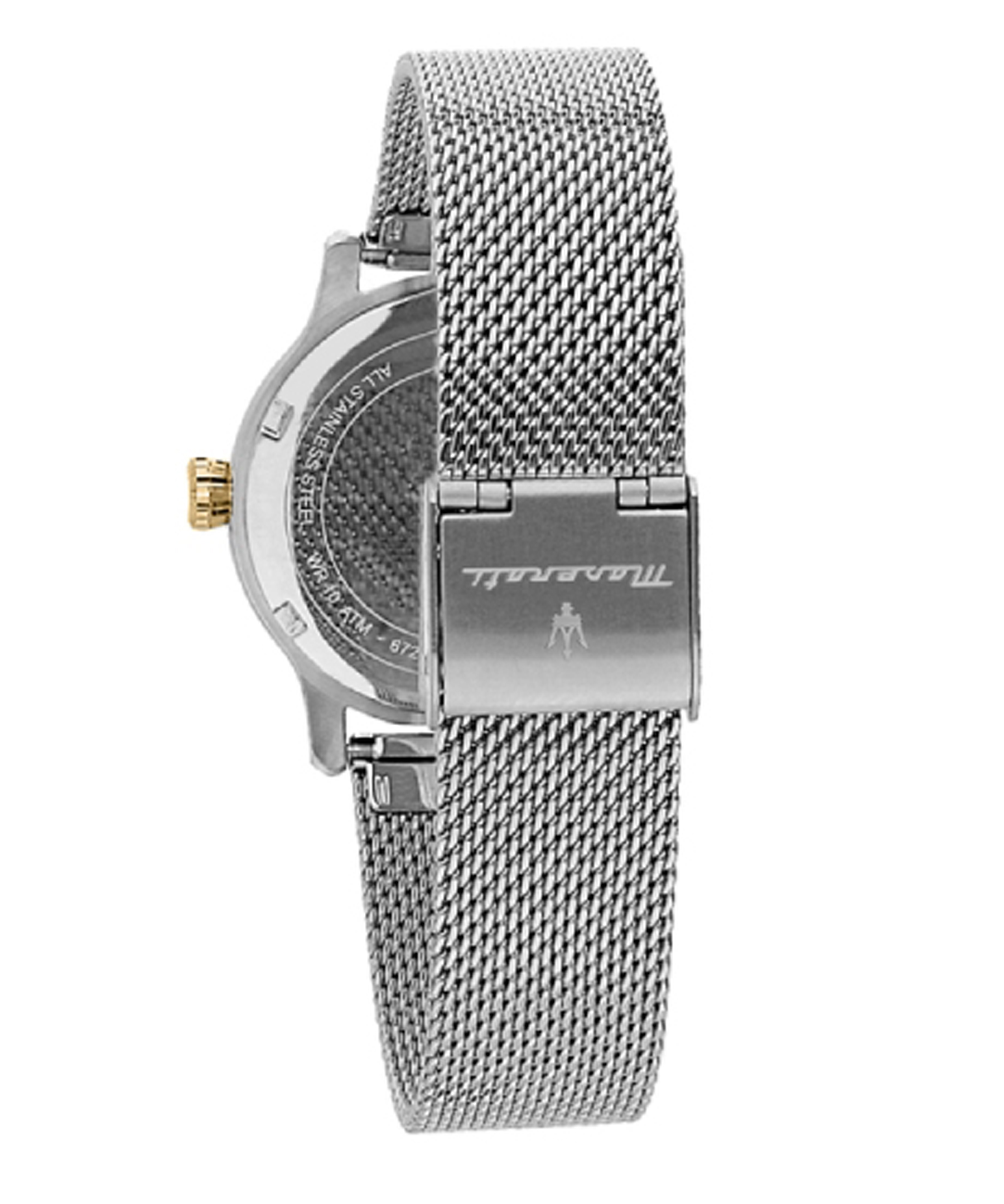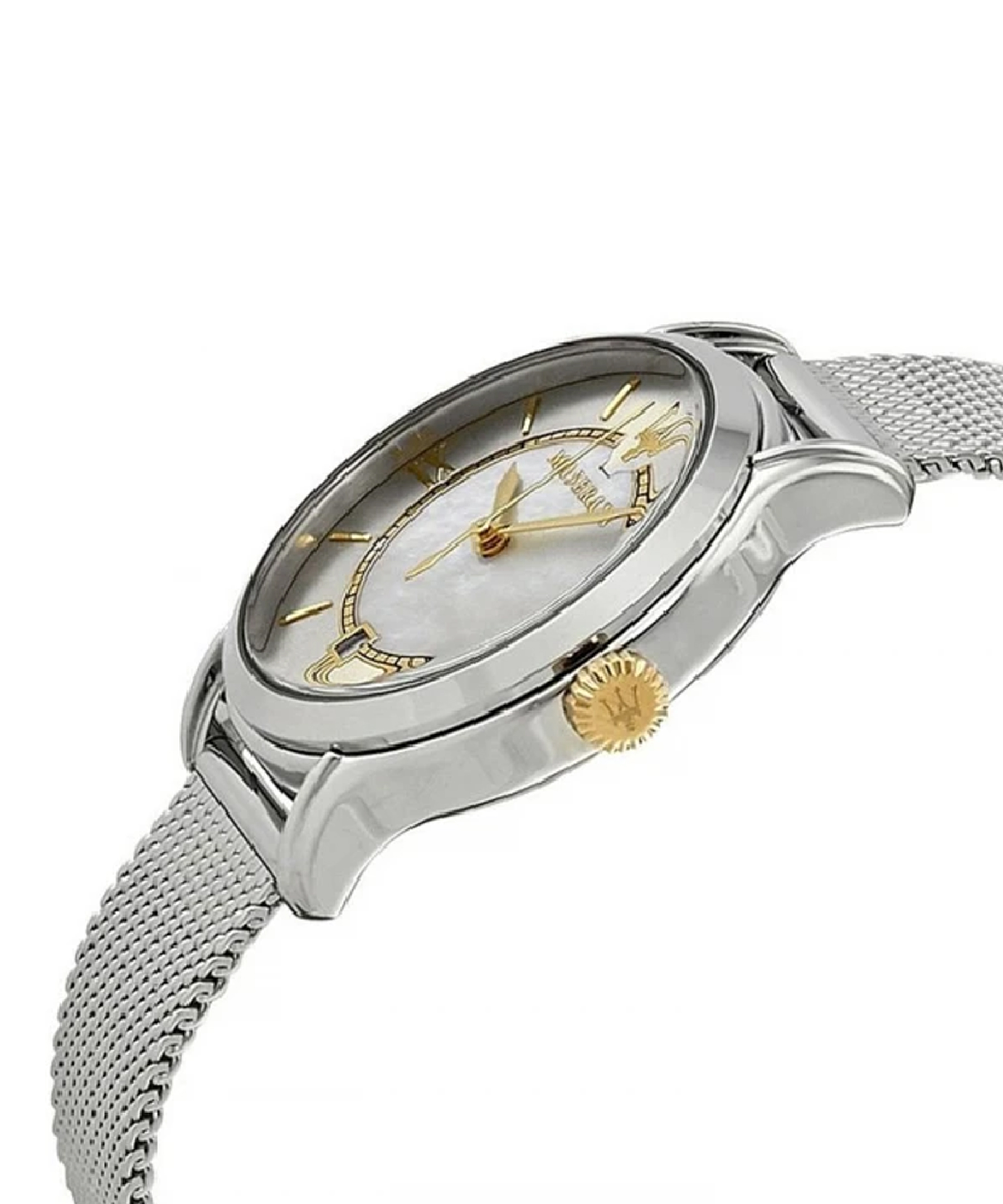 Оригінальний жіночий годинник MASERATI R8853118514 з колекції EPOCA. В годиннику встановлений надійний кварцовий механізм. Сталевий з золотистим покриттям корпус та браслет. Застібка - складна кліпса. Діаметр корпусу - 34 ммм, товщина - 9 мм. Перламутровий циферблат захищений мінеральним склом. Золотисті мітки часу. Водозахист - 10 АТМ.