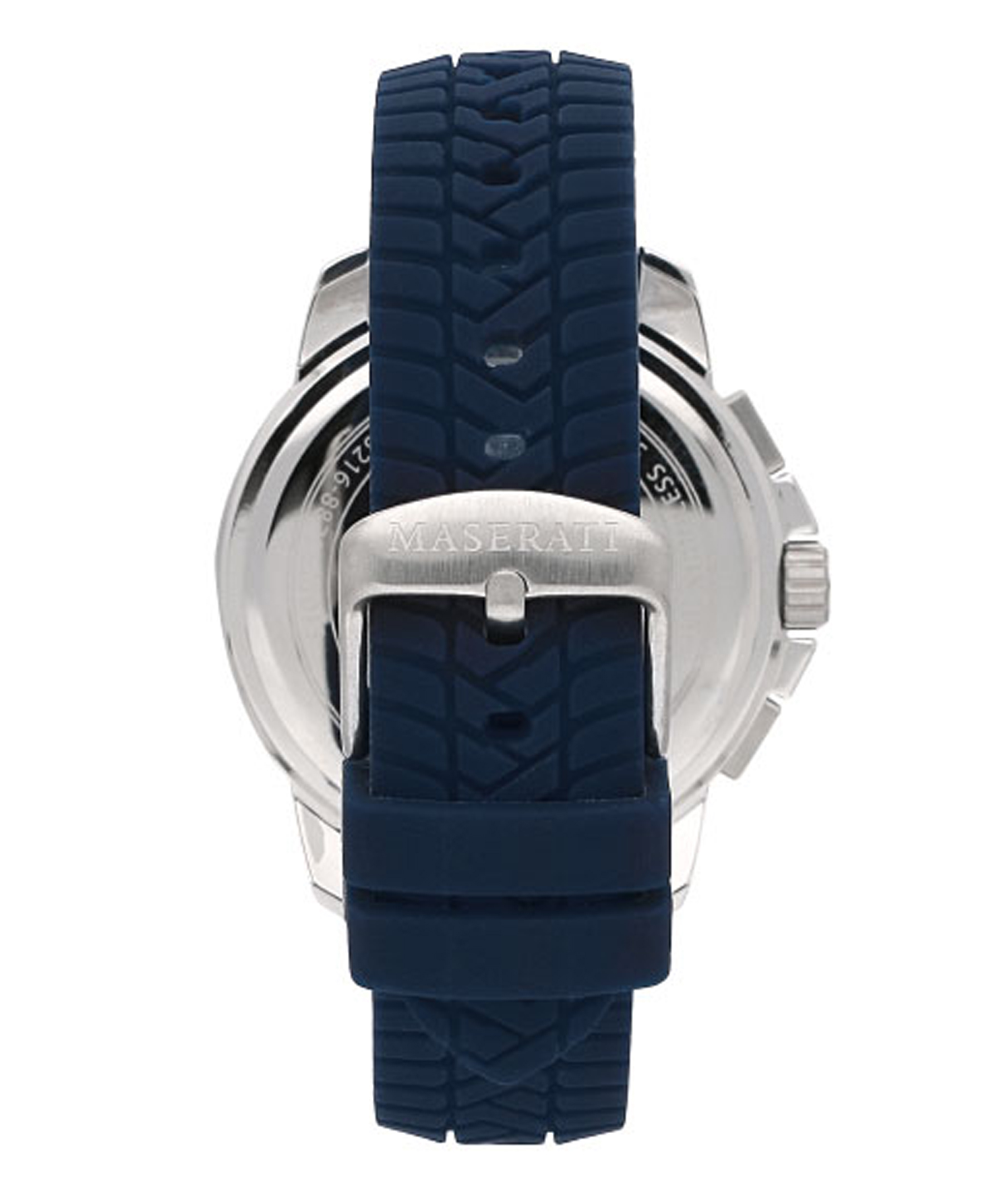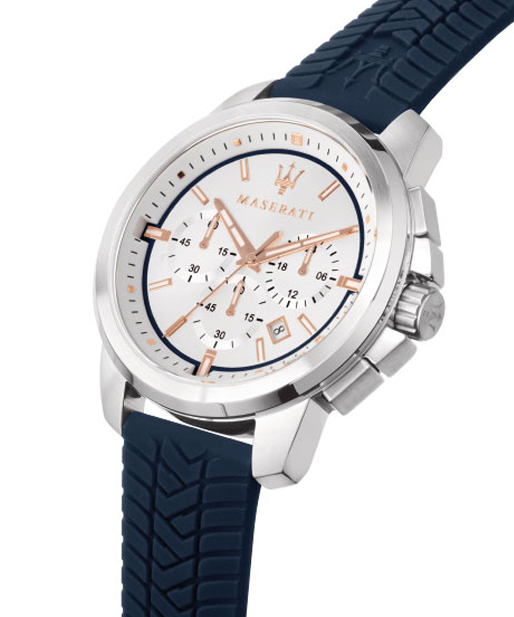 Спортивний годинник з хронографом, мультифункціональним японським механізмом з високоякісної сталі всім своїм зовнішнім виглядом нагадує про те, що автором цього годинника є престижна кампанія Maserati, відома як виробник дорогих, респектабельних автомобілів. Синій ремінець у вигляді протектора колеса машини, білий циферблат, що нагадує спідометр, тризуб з металу рожевого золота – логотип Maserati, свідчать про силу та мужність власника цього аксесуара.