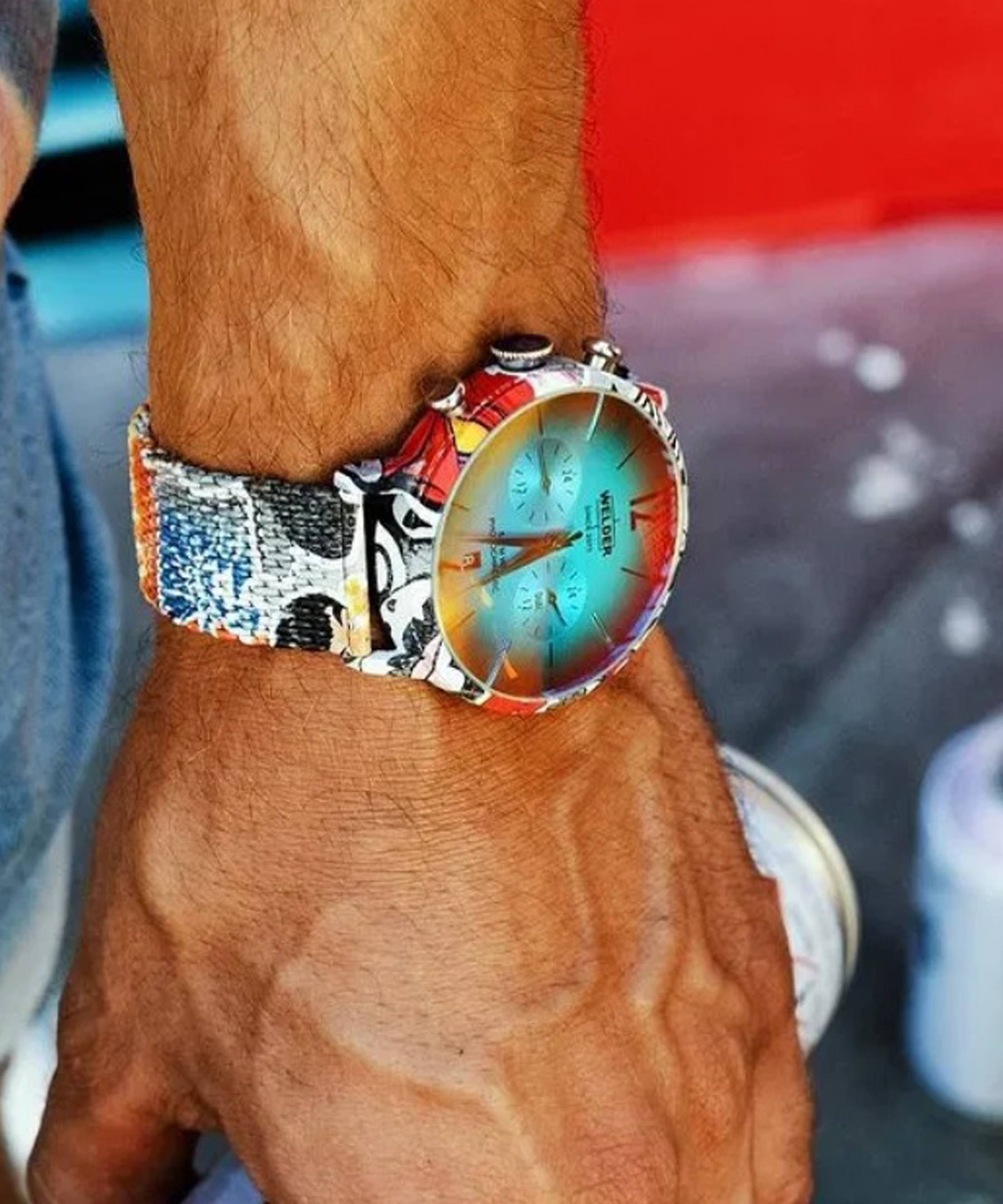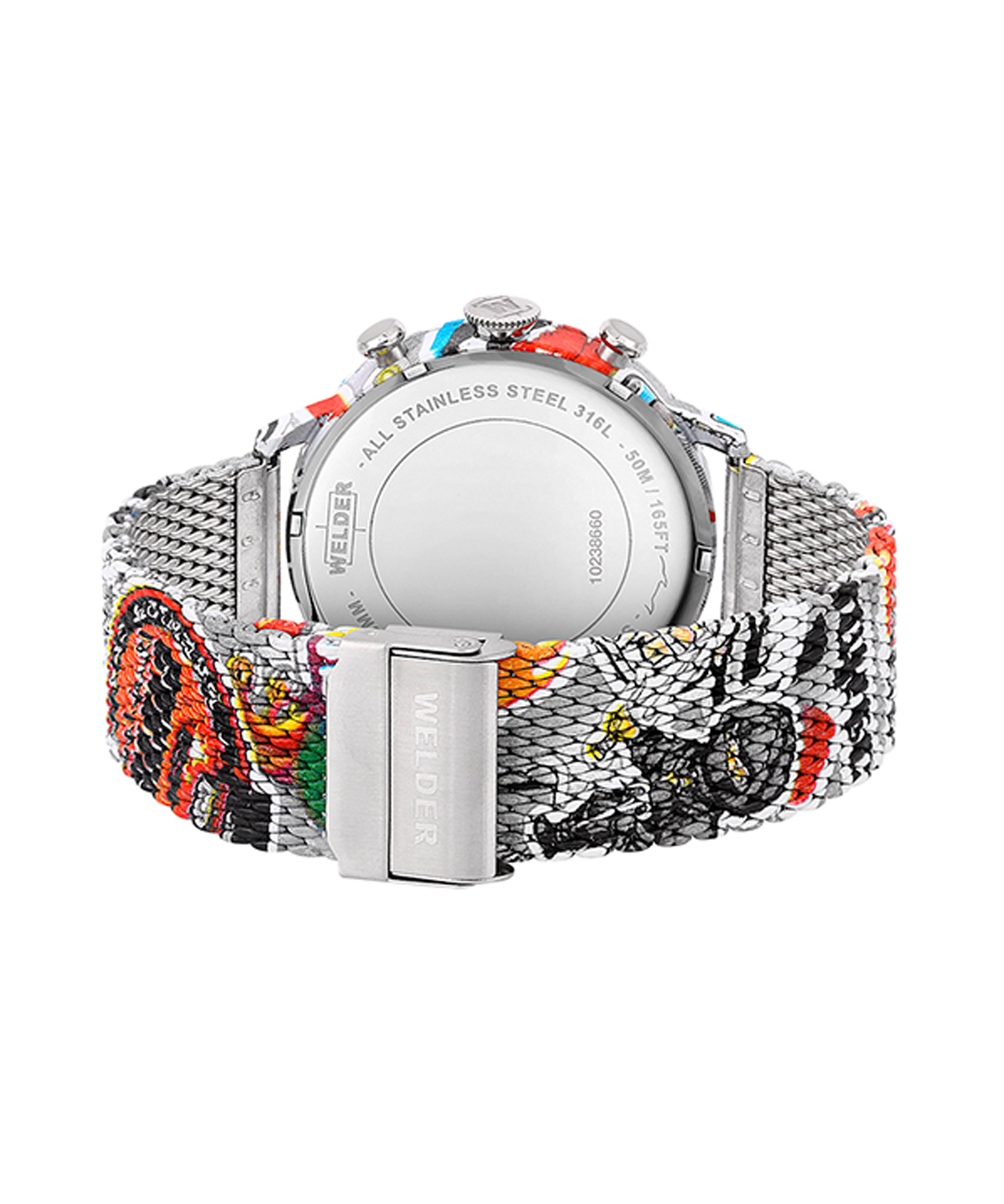 Дизайнерський годинник Welder з колекції Moody з якісним японським механізмом Miyota. Суворість ліній та форм - “оживляється” типовою для Welder особливістю: яскраве фотохромне скло змінює забарвлення залежно від освітлення, нахилу руки та кута зору. На циферблаті розташовані два мініциферблати з двома часовими поясами, що створюють особливе відчуття часу. Скло має підвищену міцність і прозорість. Браслет виконаний у техніці "міланського плетіння" з нанесенням незвичайного принта , що нагадує рептилію, у стилі “графіті”, що надає аксесуару додаткову привабливість та оригінальність. Дуже гармонійне поєднання безлічі кольорів на безеле та на браслеті створює картину, гідну Кандинського. Ключ і кнопки управління механізмом розташовані зліва, що не заважає згинати руку і виглядає досить оригінально. Аксесуар, який може стати Вам гідною прикрасою!