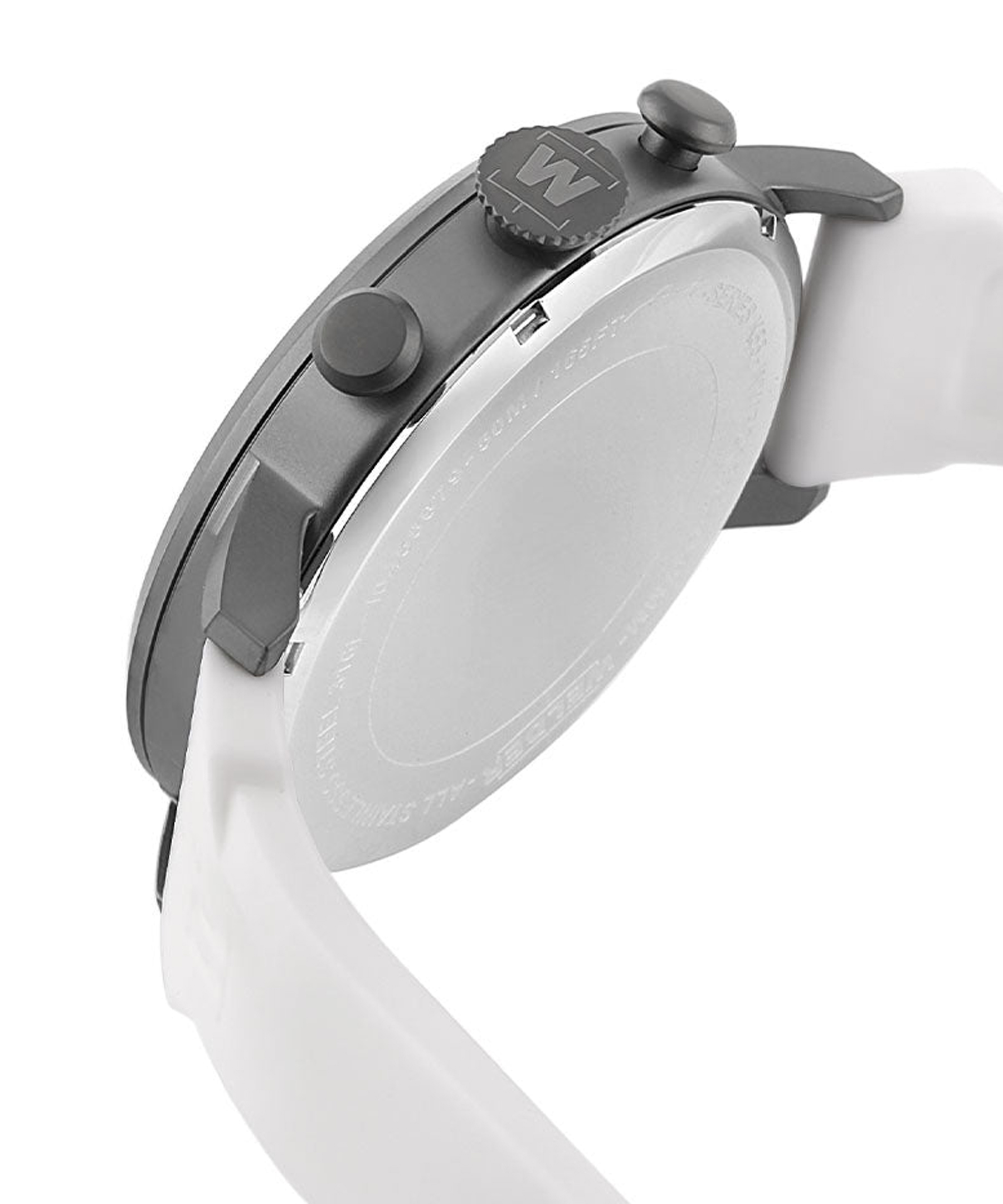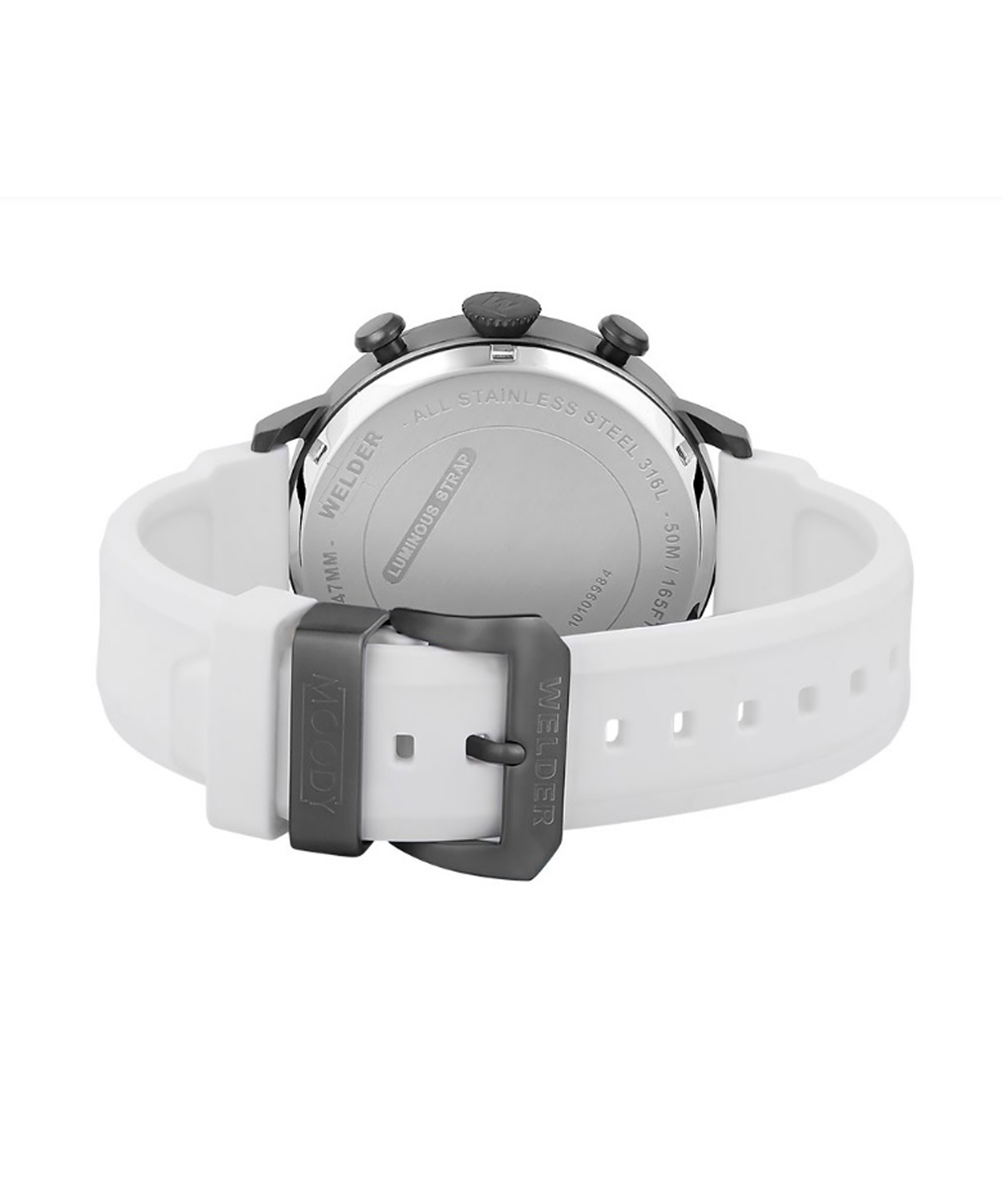 Оригінальний чоловічий годинник популярної італійської компанії Welder. Якісна сталь, смарагдовий циферблат, білий силіконовий ремінець з логотипом бренду доповнюються головною ознакою – куполоподібним фотохромним склом, яке заломлює світлові промені та змінює колір залежно від освітлення та нахилу руки. Мінеральний склад скла надає йому особливої міцності та прозорості. Ще одна особливість моделі – світлодіодне підсвічування циферблату. Діаметр корпусу 47 мм. Водозахист 5 АТМ. Якість, точність та естетична привабливість аксесуару зроблять Ваш вибір безпомилковим!
