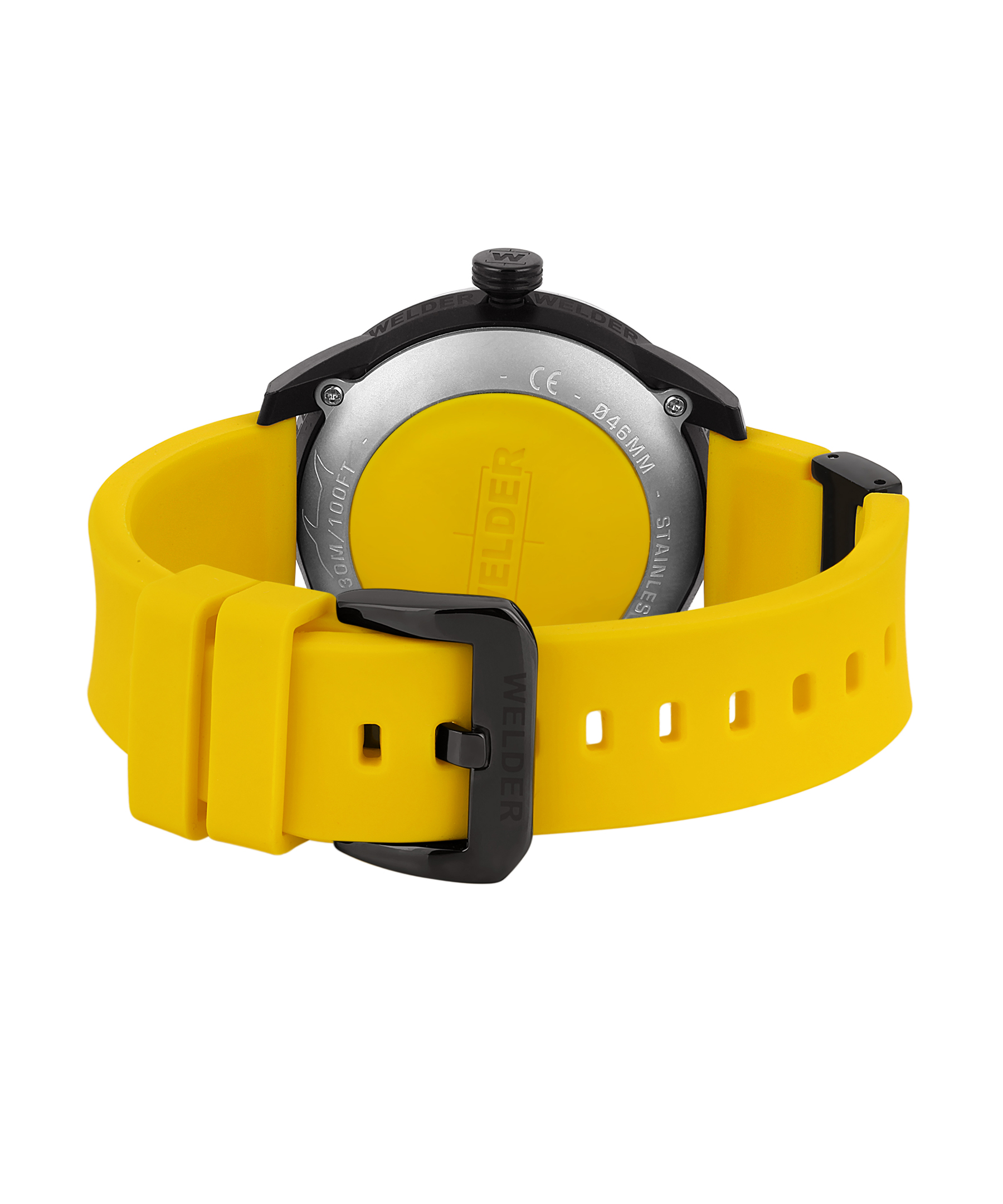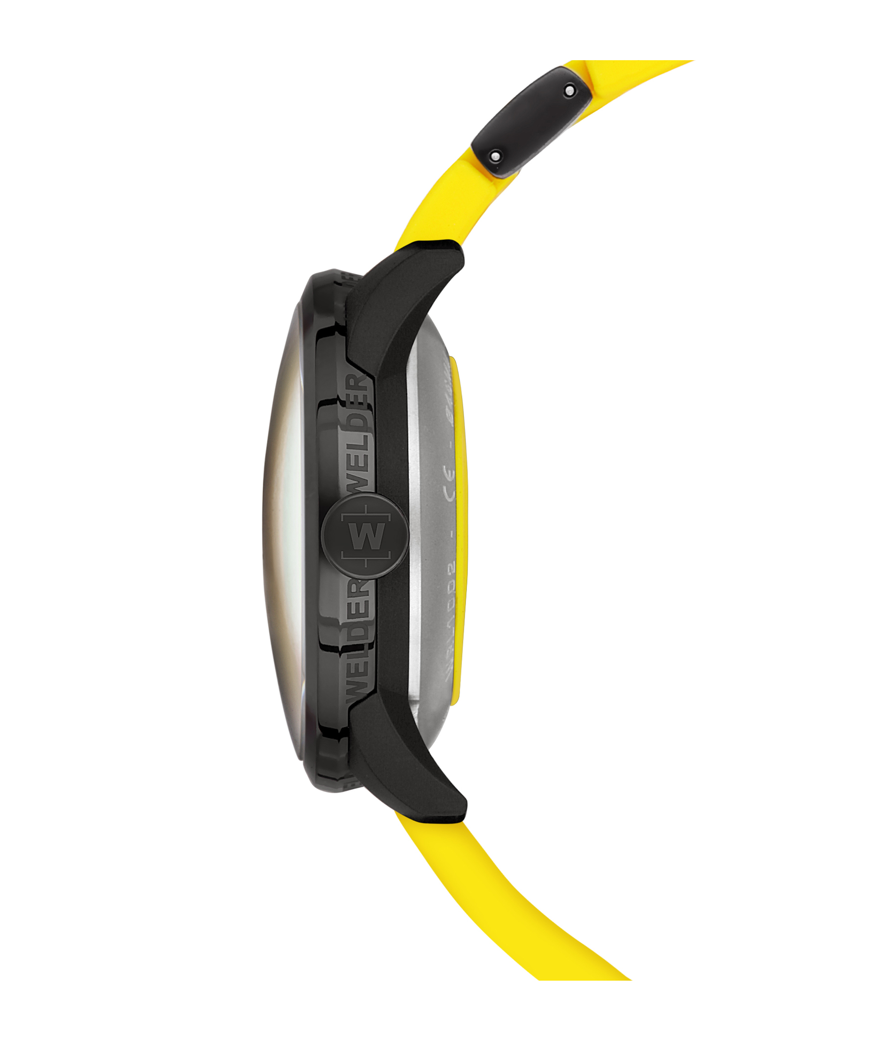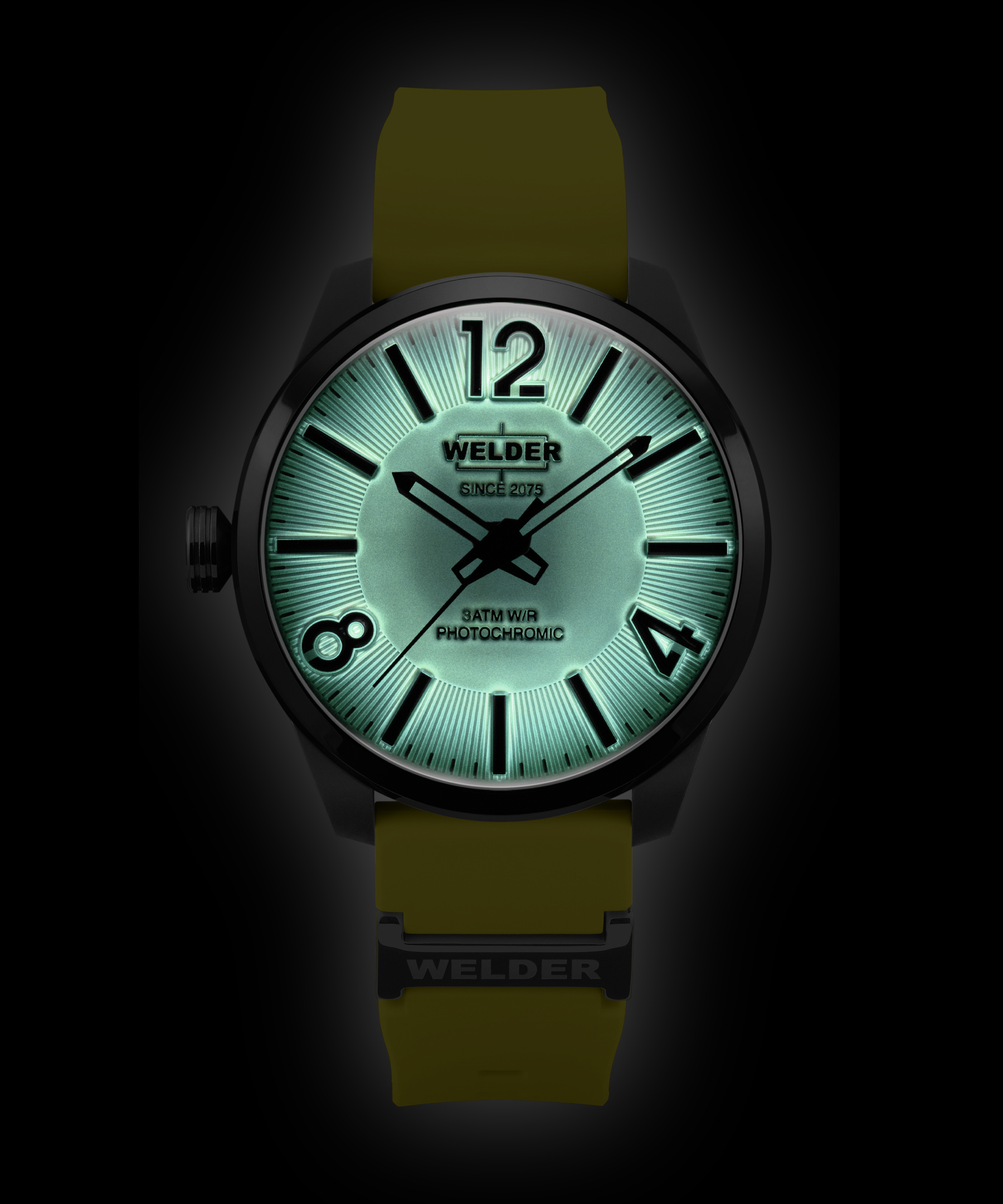 Оригінальний чоловічий годинник популярної італійської компанії Welder виконаний в яскравій кольоровій гамі. Якісна сталь з чорним покриттям, бірюзове скло циферблату, яскраво-жовтий силіконовий ремінець з логотипом бренду доповнюються головною відмітною ознакою - куполоподібним фотохромним склом, що заломлює світлові промені та змінює колір залежно від освітлення та нахилу руки. Ще одна особливість моделі - світлодіодне підсвічування циферблату. Мінеральний склад скла надає йому особливої міцності та прозорості. Діаметр 46 мм. Водозахист 3 АТМ.