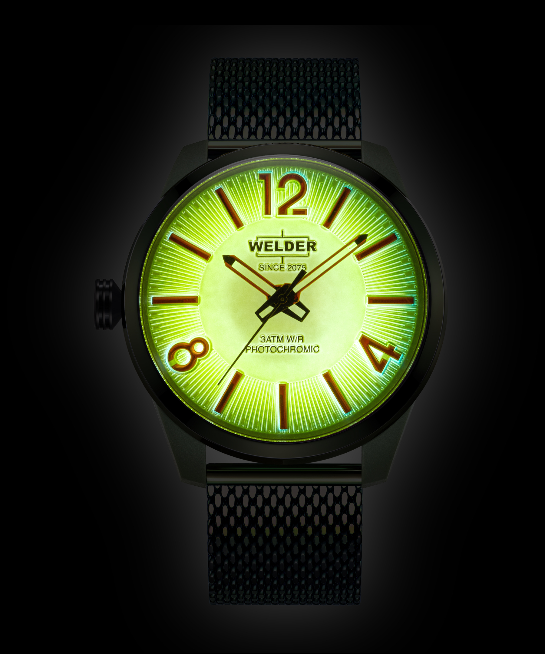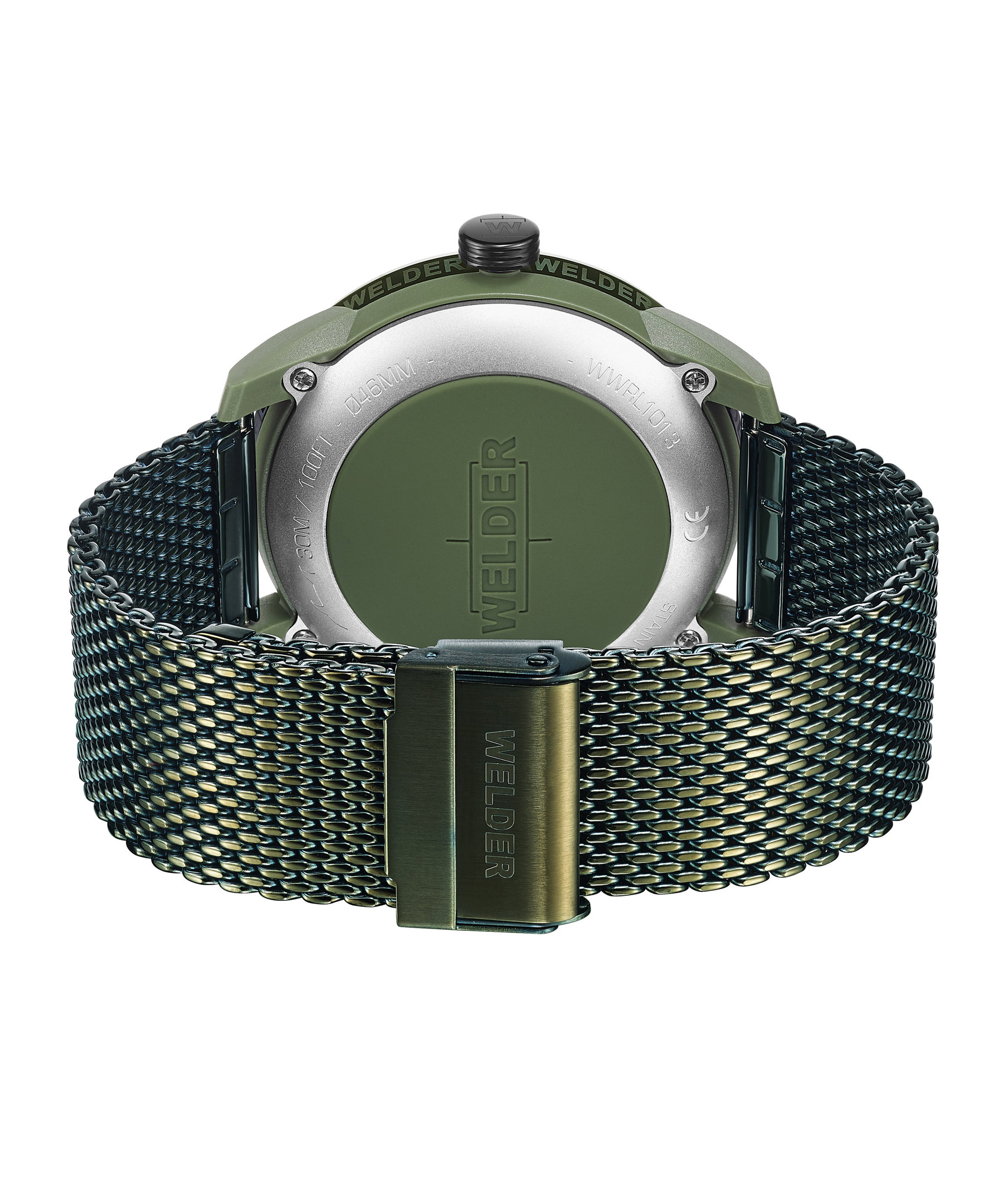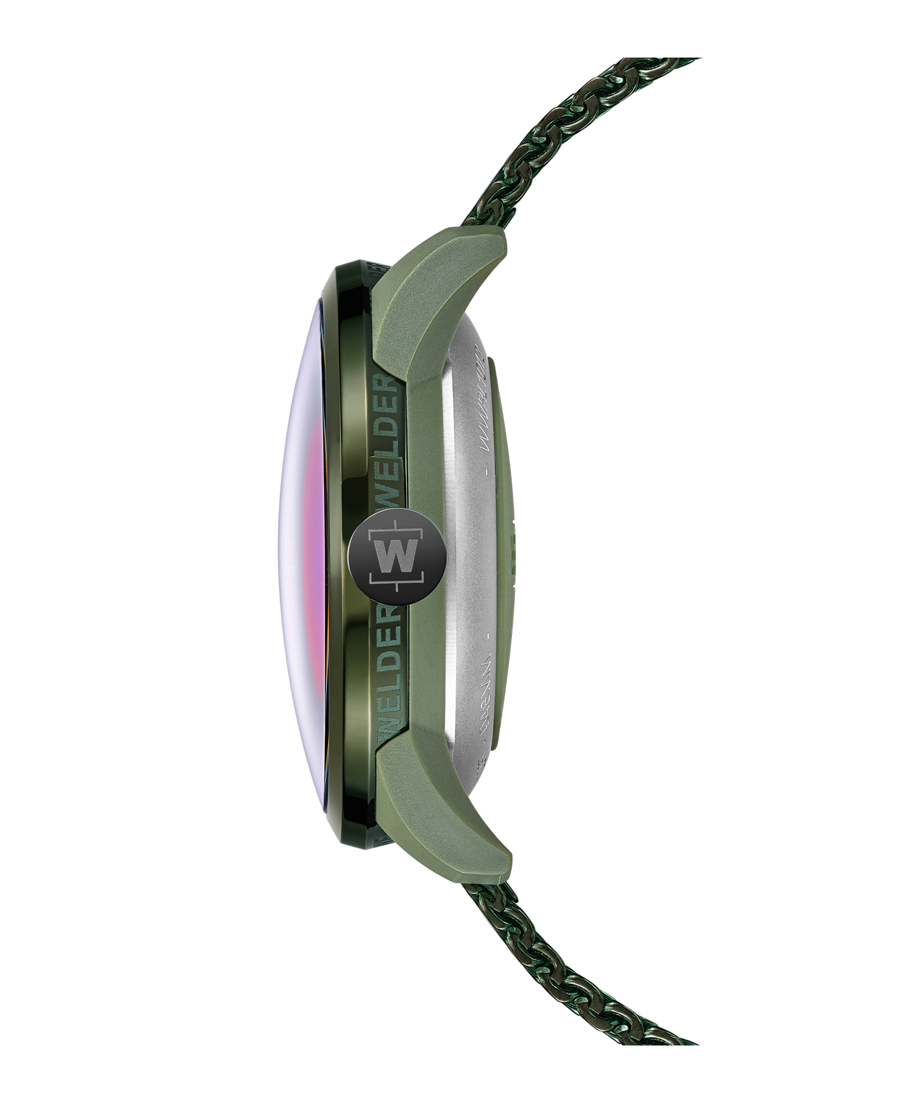 Стильний чоловічий годинник Welder з надійним японським механізмом. Корпус та браслет виконані з високоякісної сталі з PVD покриттям Olive Green. Фотохромне скло циферблата надає годинникам незвичайне забарвлення та зміну кольору в діапазоні тієї гами, яка обумовлена освітленням, кольорами вашого одягу та найменшими рухами руки! То спалахуючи, то згасаючи, як вогонь на вітрі, скло надає аксесуару надзвичайної магічної привабливості. Ще одна особливість моделі - світлодіодне підсвічування циферблату.
