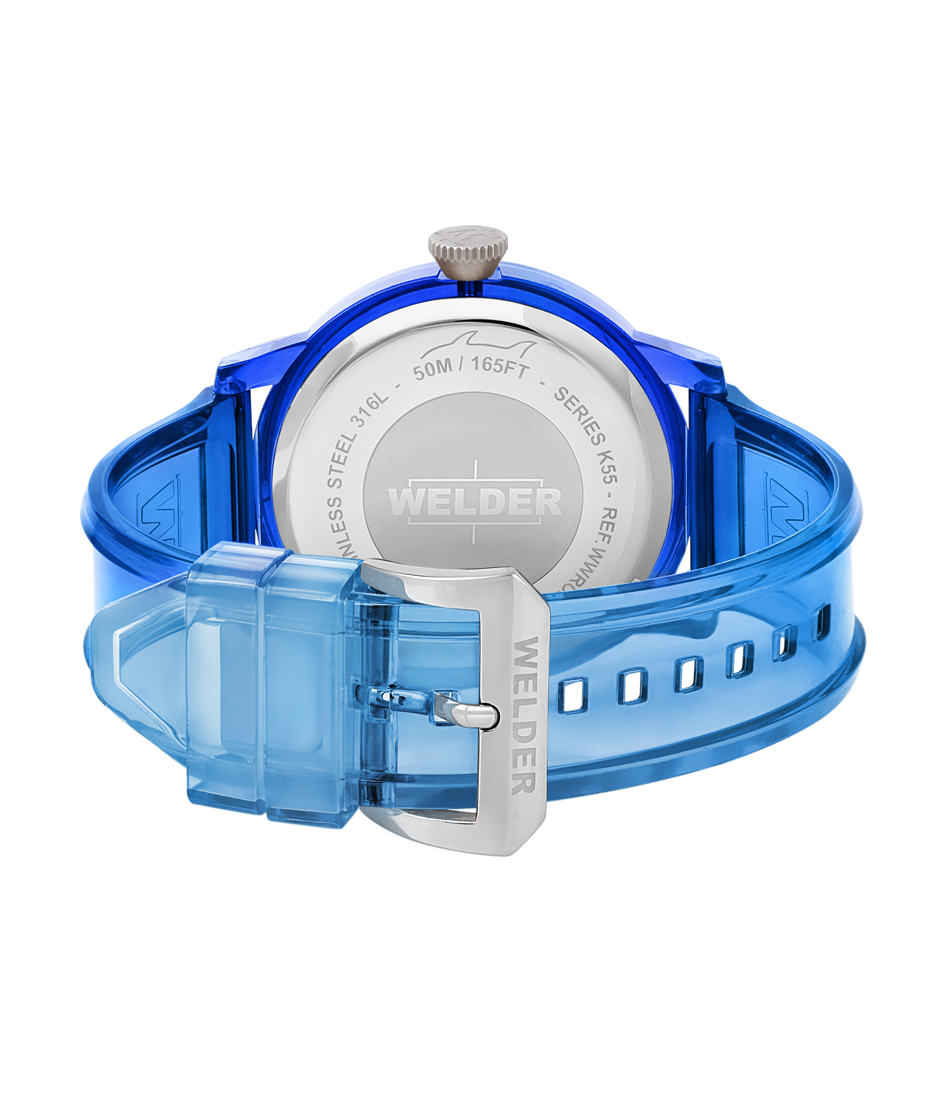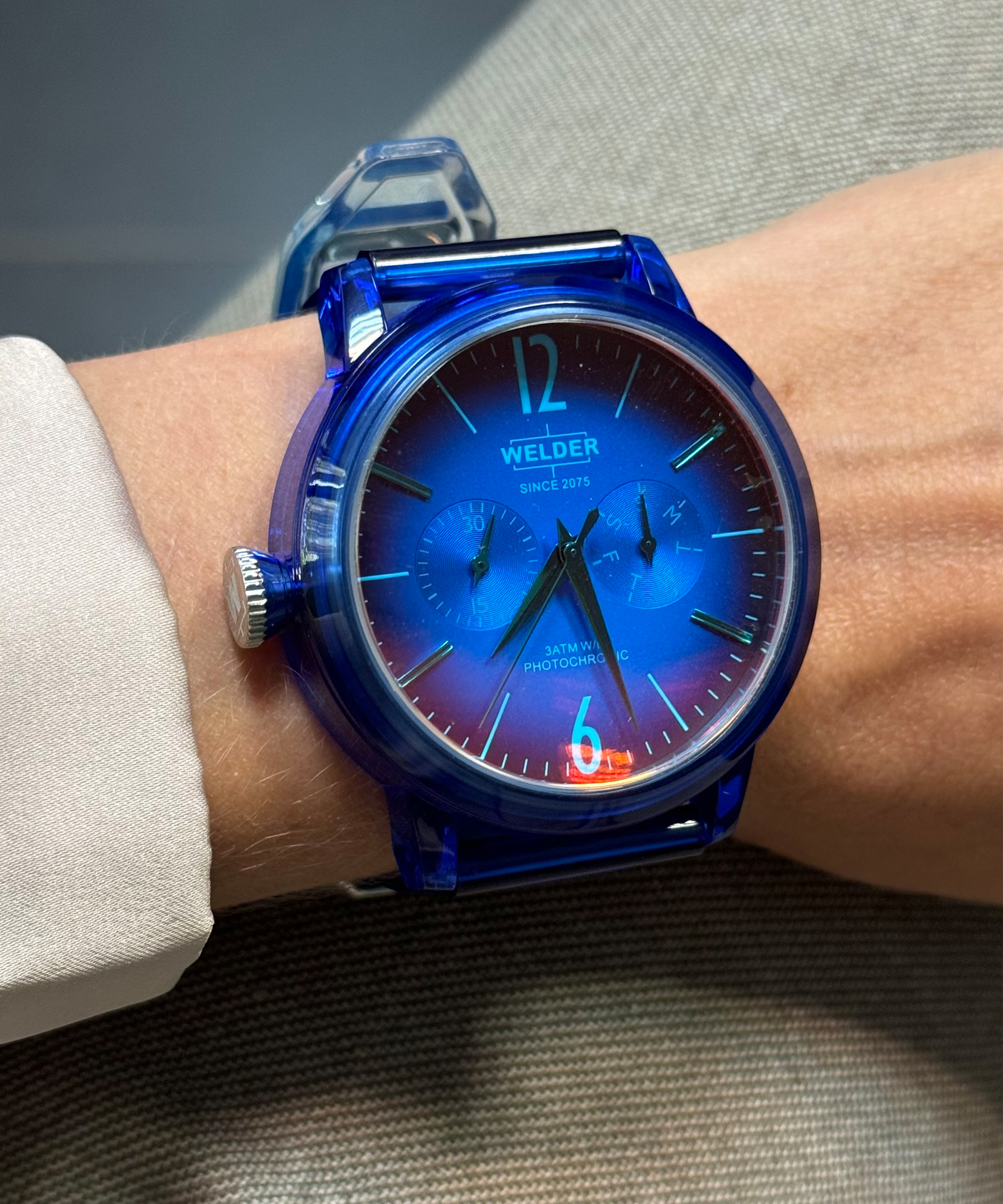 Оригінальний годинник популярної італійської компанії Welder з багатофункціональним японським механізмом Miyota виконаний в яскравій кольоровій гамі. Корпус із якісної сталі з PVD покриттям Blue, яскраво-синій силіконовий ремінець з логотипом бренду доповнюються головною відмітною ознакою - куполоподібним фотохромним склом, що заломлює світлові промені та змінює колір залежно від освітлення та нахилу руки.Мінеральний склад скла надає йому особливої міцності та прозорості. На циферблаті два індикатори дати та днів тиждня. Діаметр корпусу 45 мм. Індустріальний стиль, висока функціональність, якісні матеріали та приємна ціна. Годинник для людей, які шукають яскравих емоцій та бачення майбутнього.