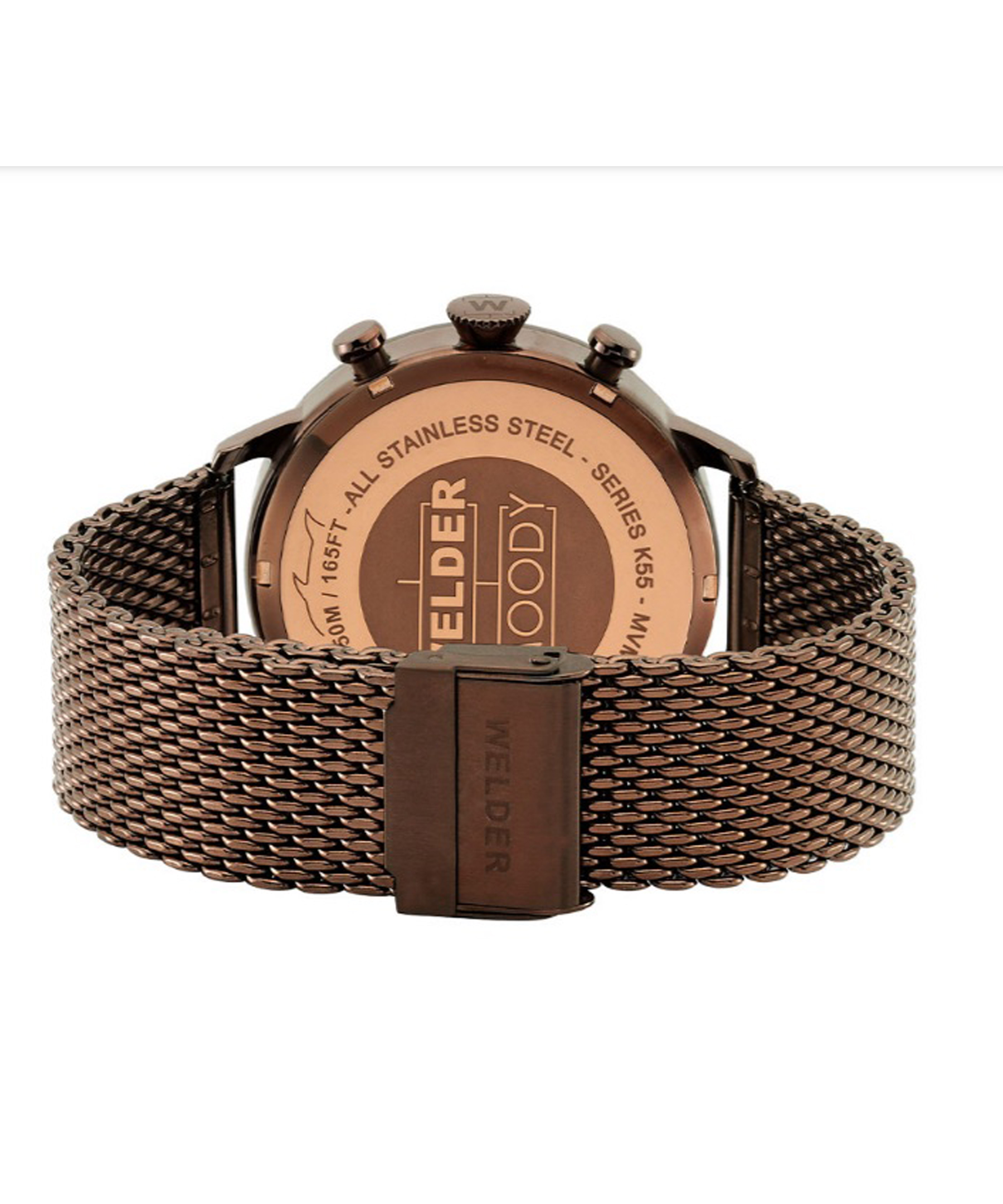 Универсальные часы Welder с надёжным японским механизмом Miyota из коллекции The Moody выполнены из металла высокого качества с бронзовым напылением на корпусе и на браслете, выполненном в технике миланского плетения. Циферблат с фотохромным куполообразным стеклом придает часам магическое мерцание света и красок. Цветовая гамма в коньячно-ванильных тонах создает ощущение тепла и уюта. Смена красок зависит от освещения, угла обзора и малейшего движения руки. Три кнопки управления механизмом расположены слева от циферблата и кроме прямого назначения выполняют декоративную функцию. Индикатор даты, два минициферблата с двумя часовыми поясами, стандартная водозащита, делают часы более функциональными и привлекательными.