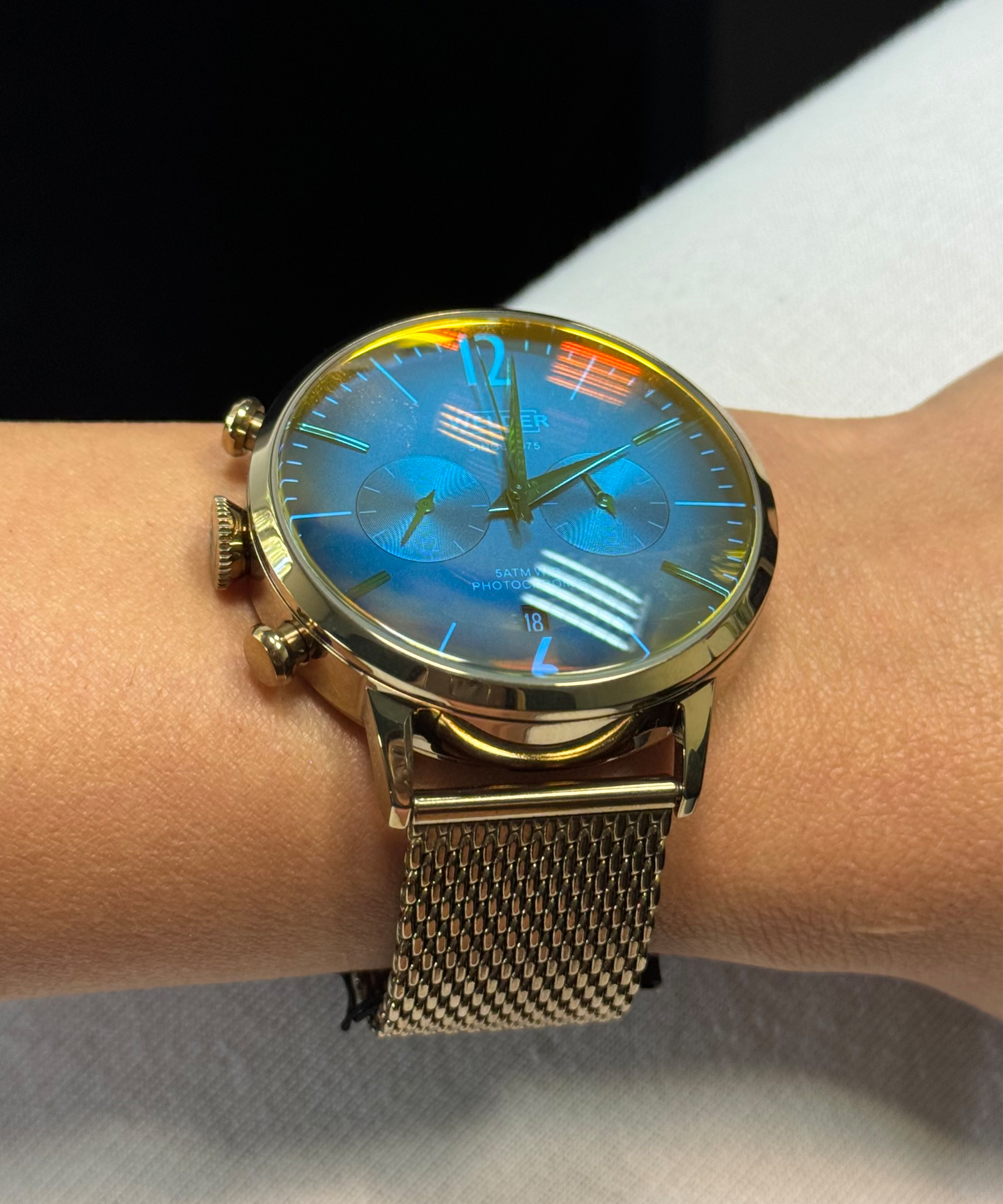 Циферблат насыщенного зеленого цвета покрыт фотохромным стеклом, меняющим свой цвет от изумрудного до оранжевого. Любое движение руки и малейшее изменение освещения - в один миг Ваши часы поменяли свой облик! Корпус и браслет, выполненный в стиле миланского плетения с покрытием Bronze Gold, гармонично сливаются с циферблатом в одну мерцающую картину. Изящные метки часов лаконичны и элегантны, что придает аксессуару светящуюся легкость.